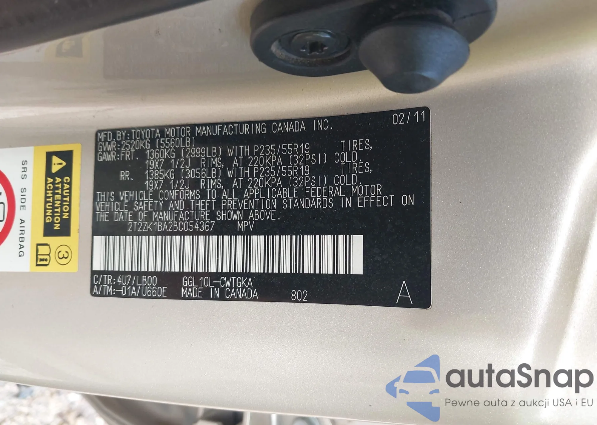• VIN 2T2ZK1BA2BC054367