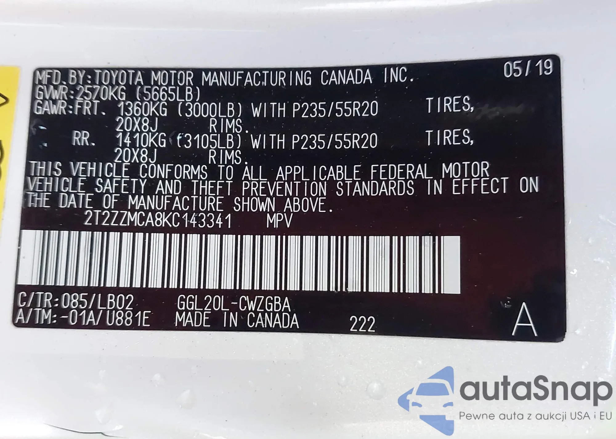 • VIN 2T2ZZMCA8KC143341