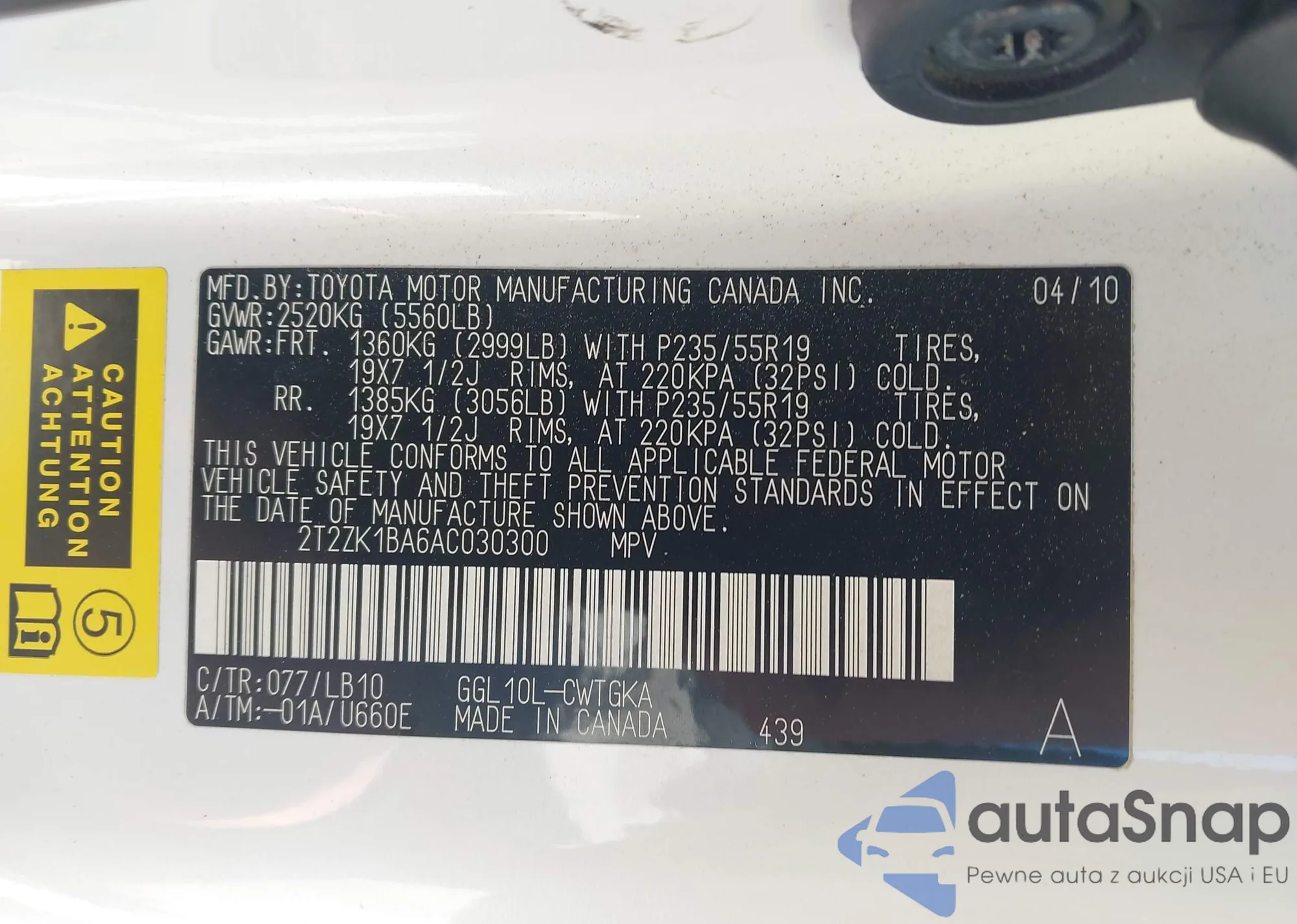 • VIN 2T2ZK1BA6AC030300