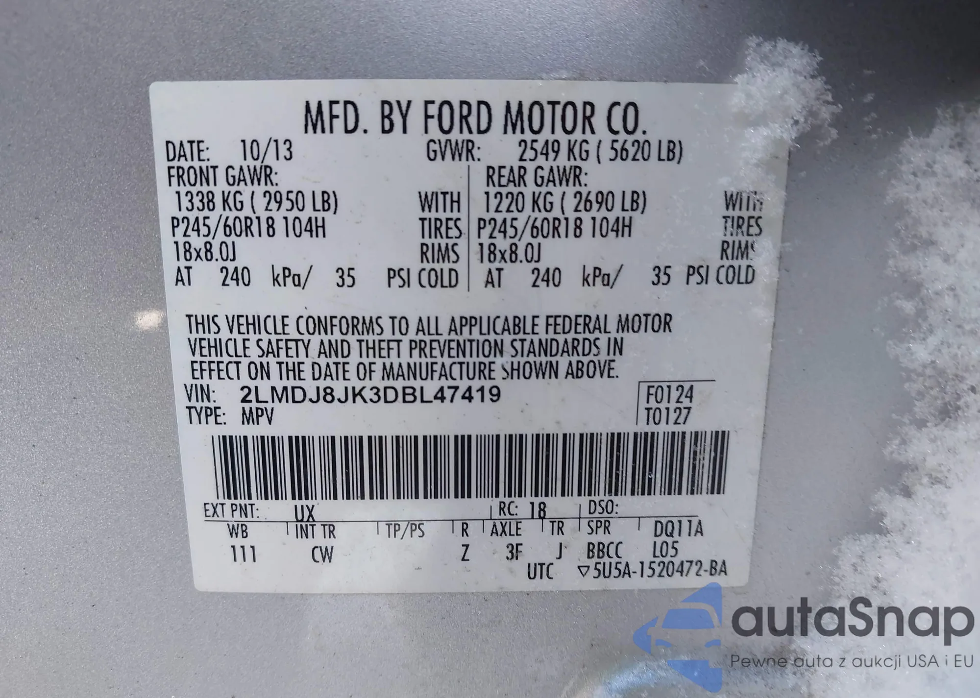 LOT: 44245667 VIN: 2LMDJ8JK3DBL47419