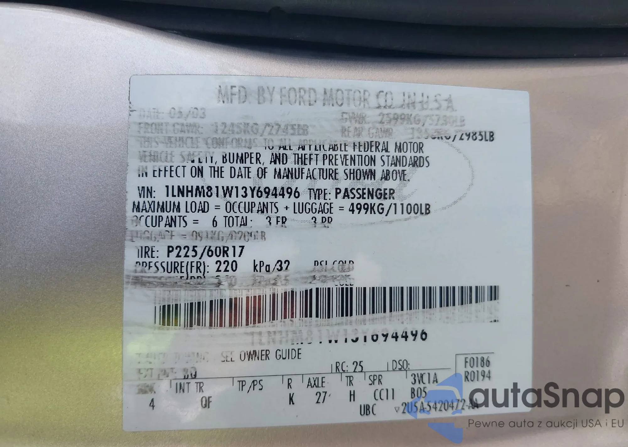 • VIN 1LNHM81W13Y694496