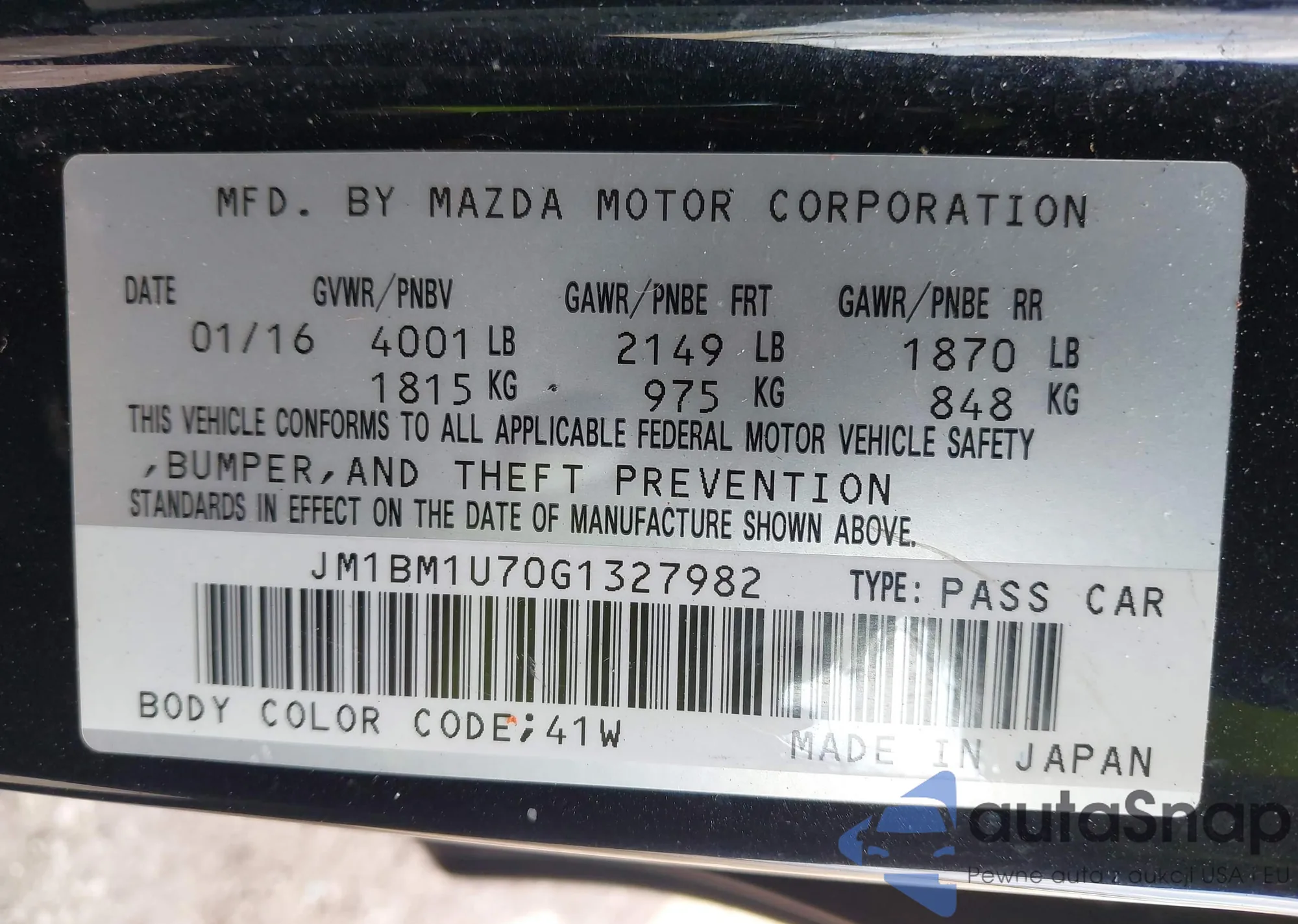 LOT: 44423398 VIN: JM1BM1U70G1327982