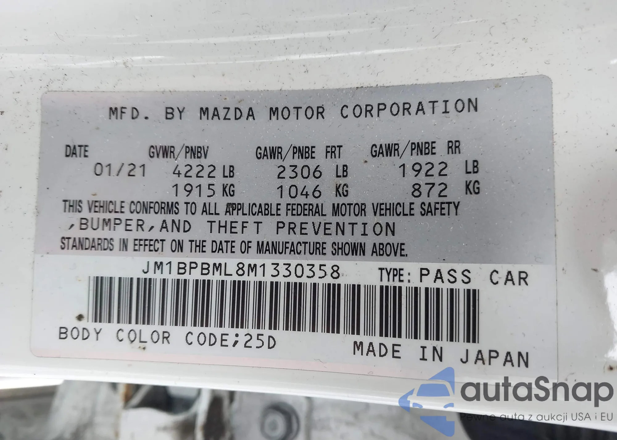 LOT: 44126669 VIN: JM1BPABL7M1328095