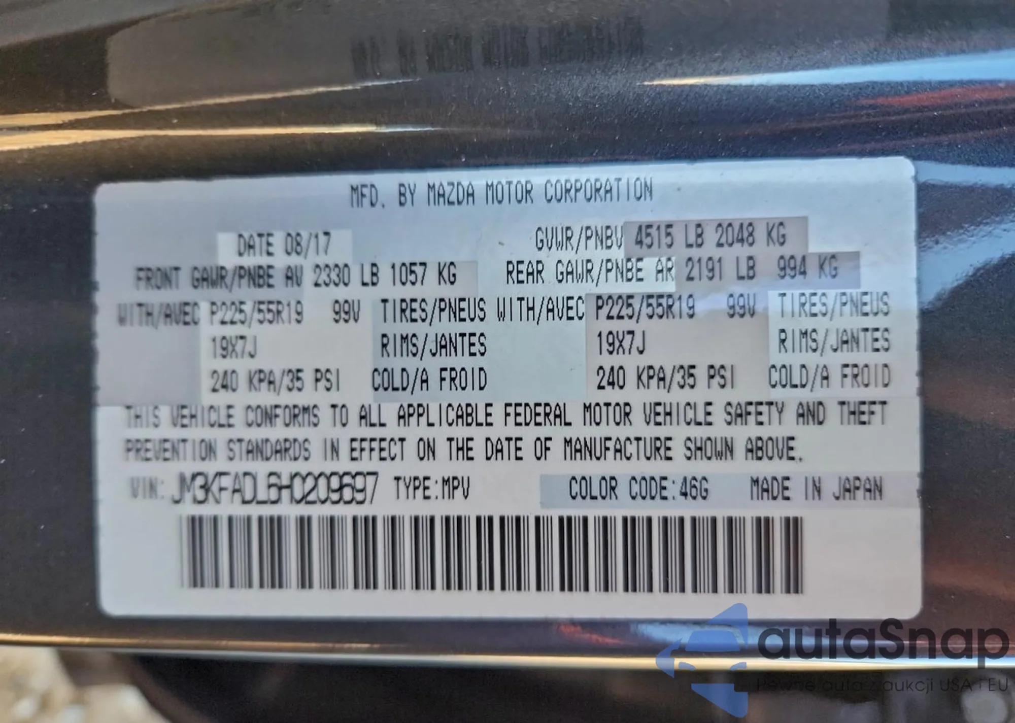 LOT: 97029995 VIN: JM3KFADL6H0209697
