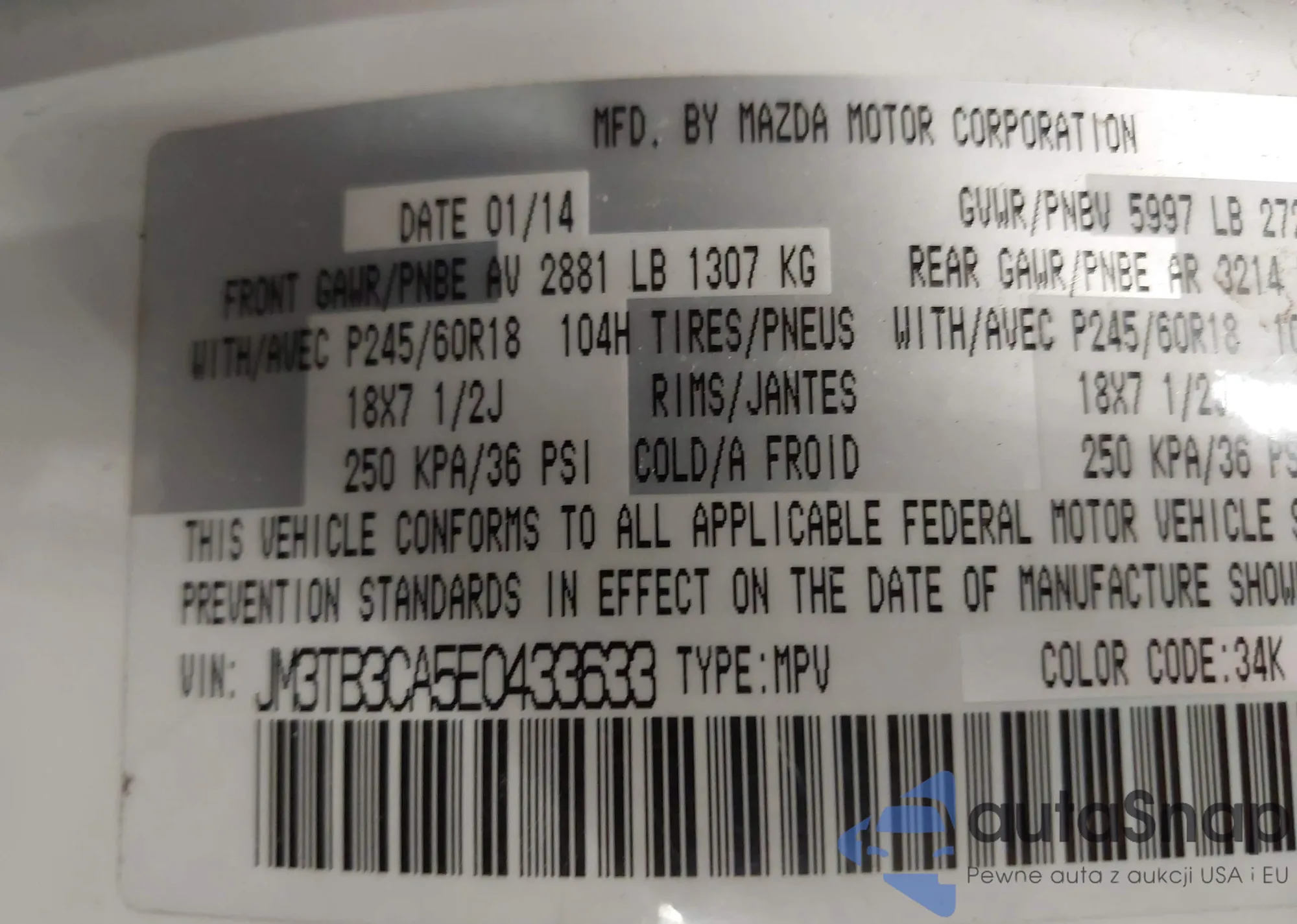 LOT: 44195476 VIN: JM3TB3CA5E0433633