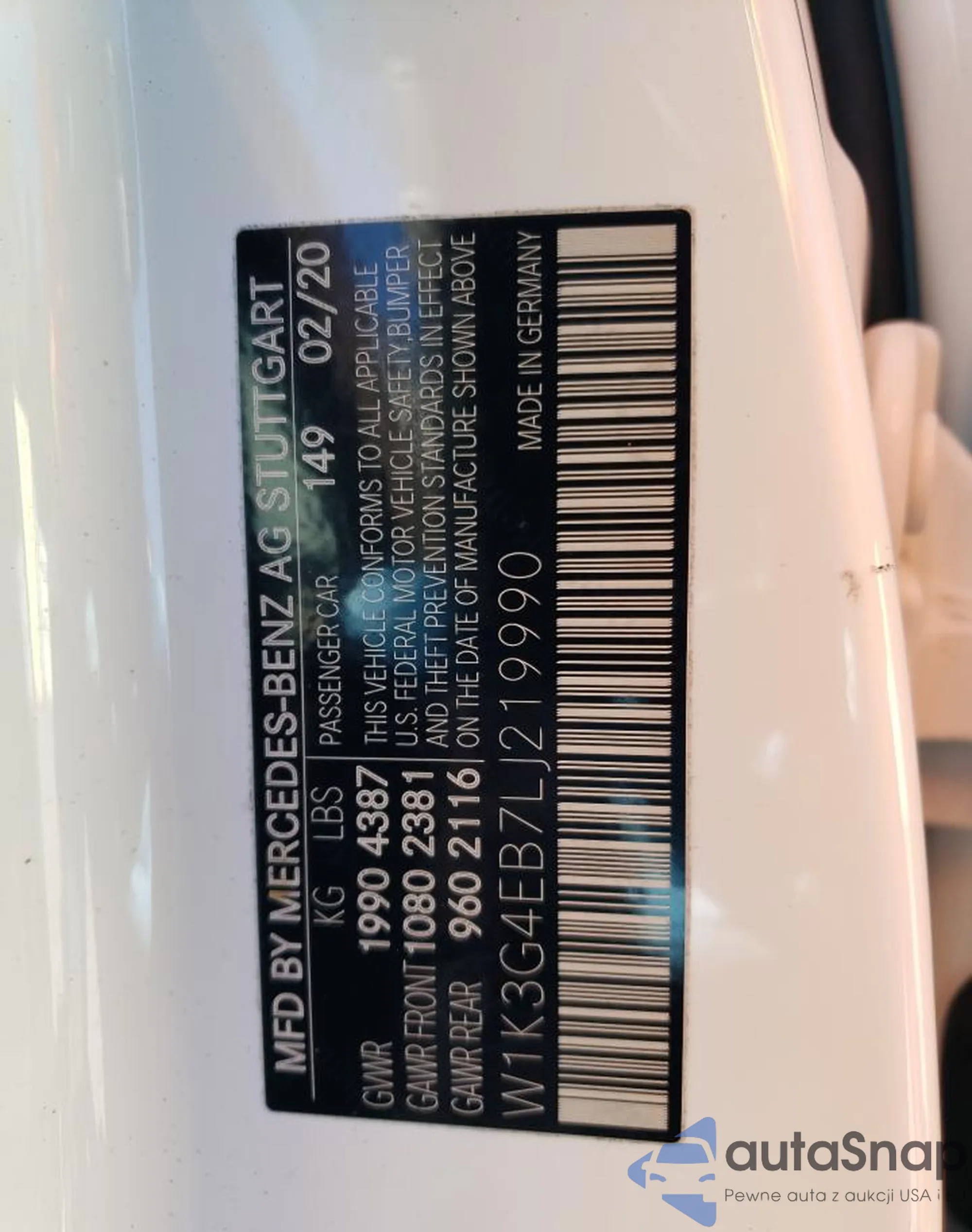 LOT: 65668453 VIN: WDD3G4EB2LW038380