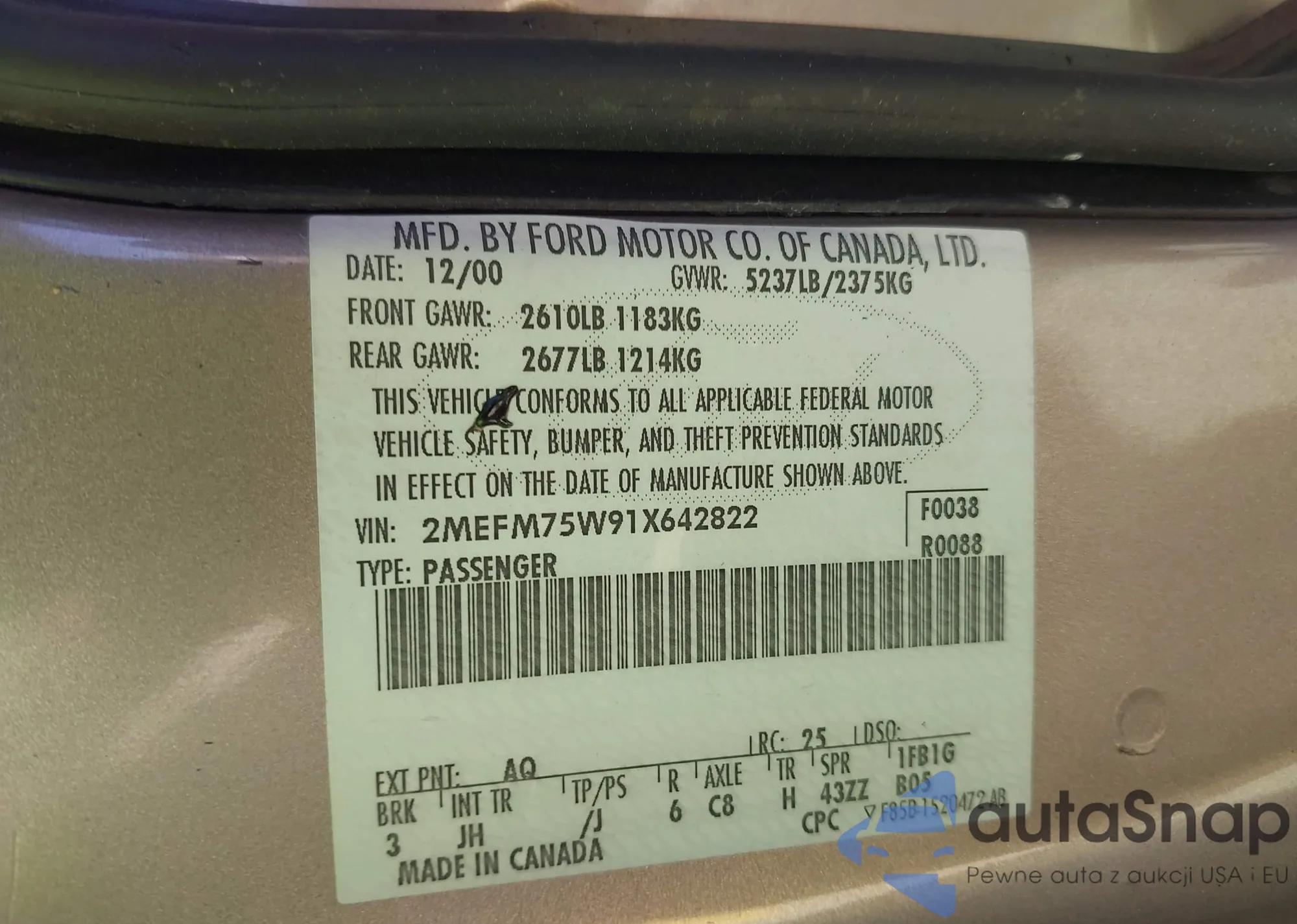 LOT: 43896511 VIN: 2MEFM75W1YX658703