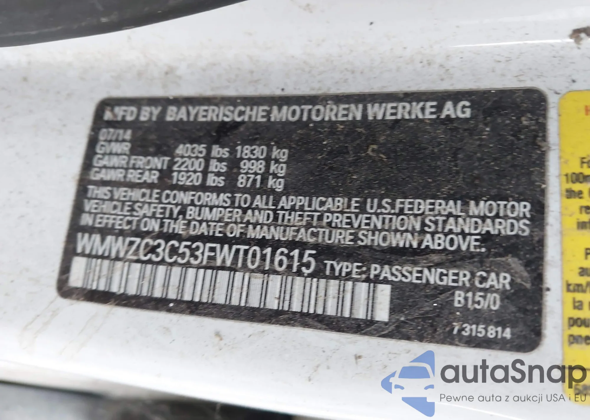LOT: 44167238 VIN: WMWZC3C53FWT01615