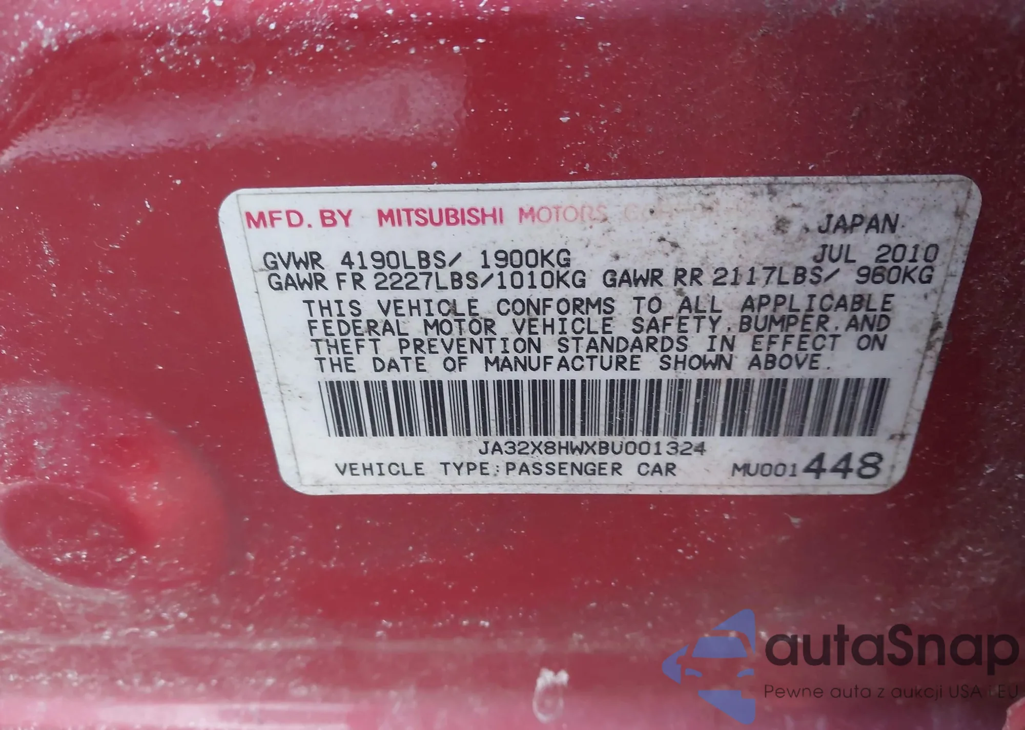 LOT: 44195730 VIN: JA32U8FW7BU014236