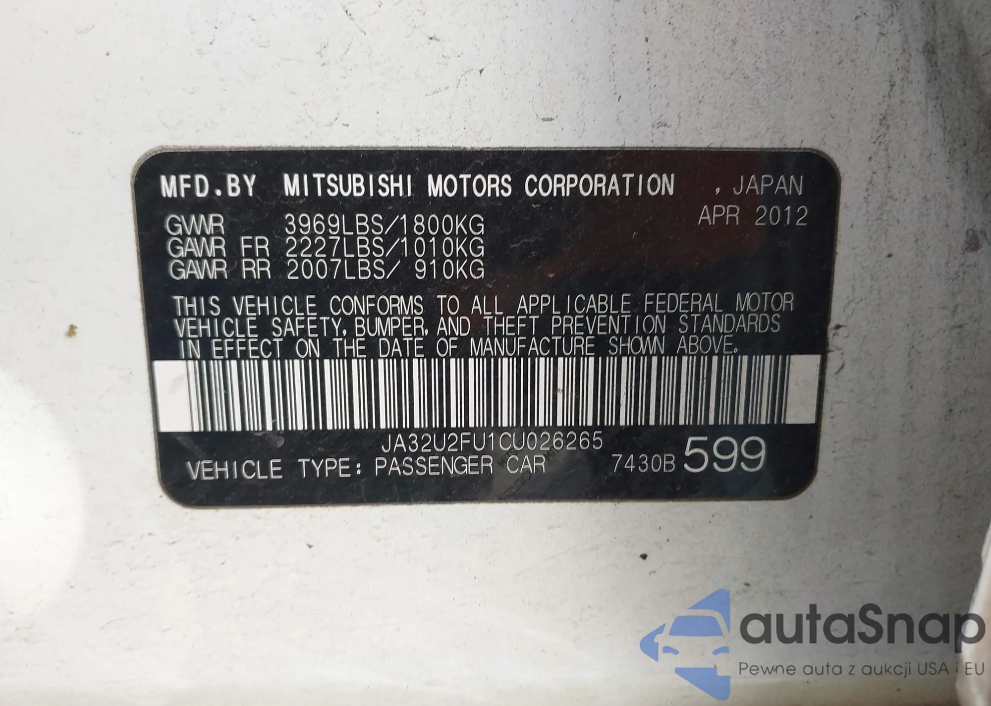 LOT: 44027681 VIN: JA32U8FW8CU025084