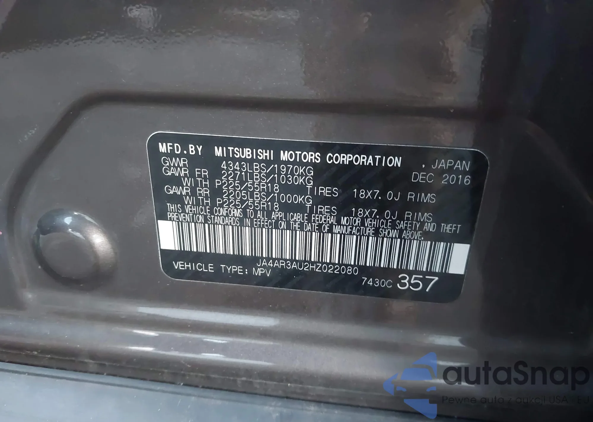 LOT: 43505841 VIN: JA4AP3AU9HZ065109