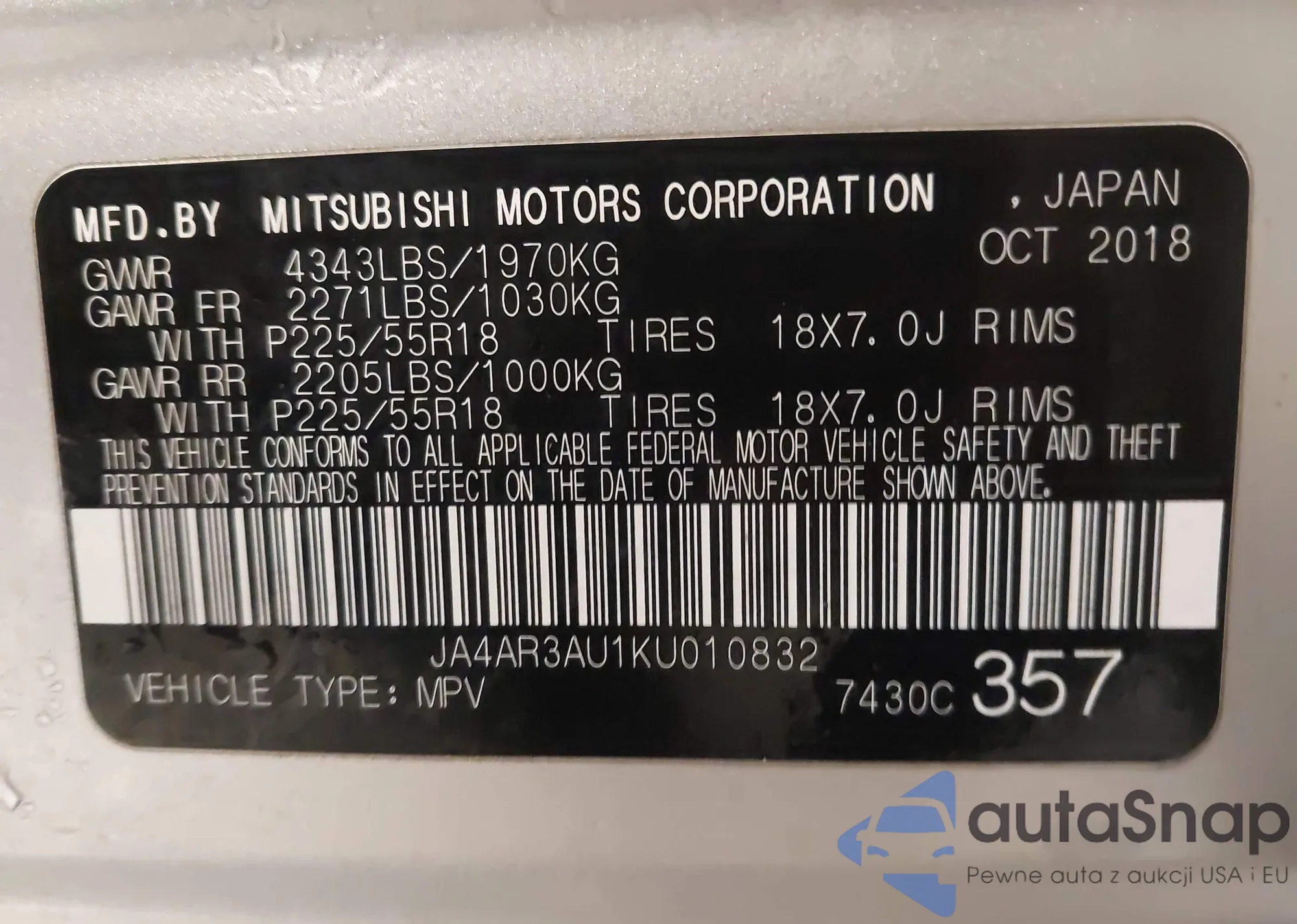 LOT: 44267935 VIN: JA4AR3AU1KU010832