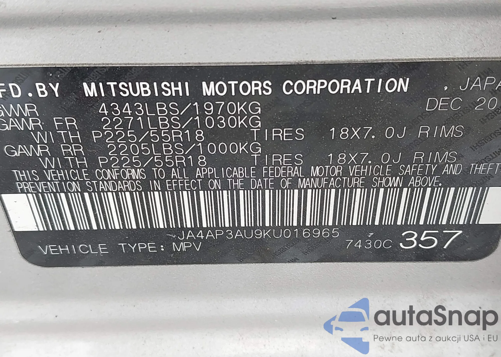 LOT: 44301976 VIN: JA4AP3AU9KU016965