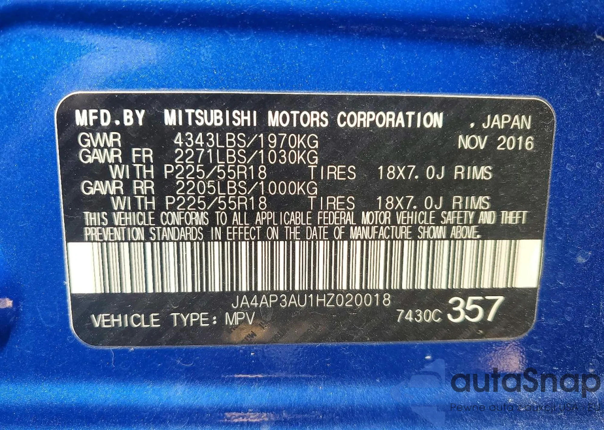 LOT: 73447815 VIN: JA4AP3AU1HZ020018