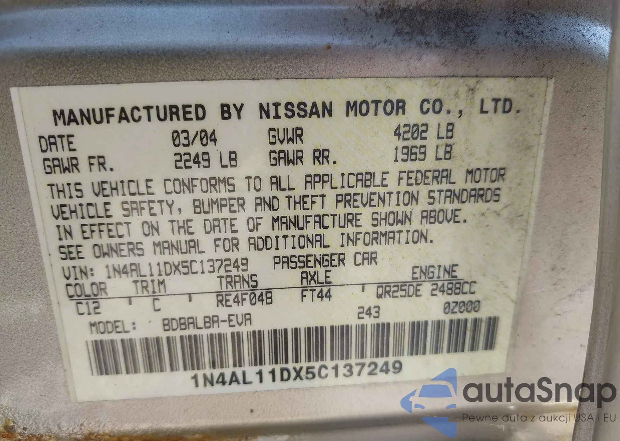 • VIN 1N4AL11DX5C137249