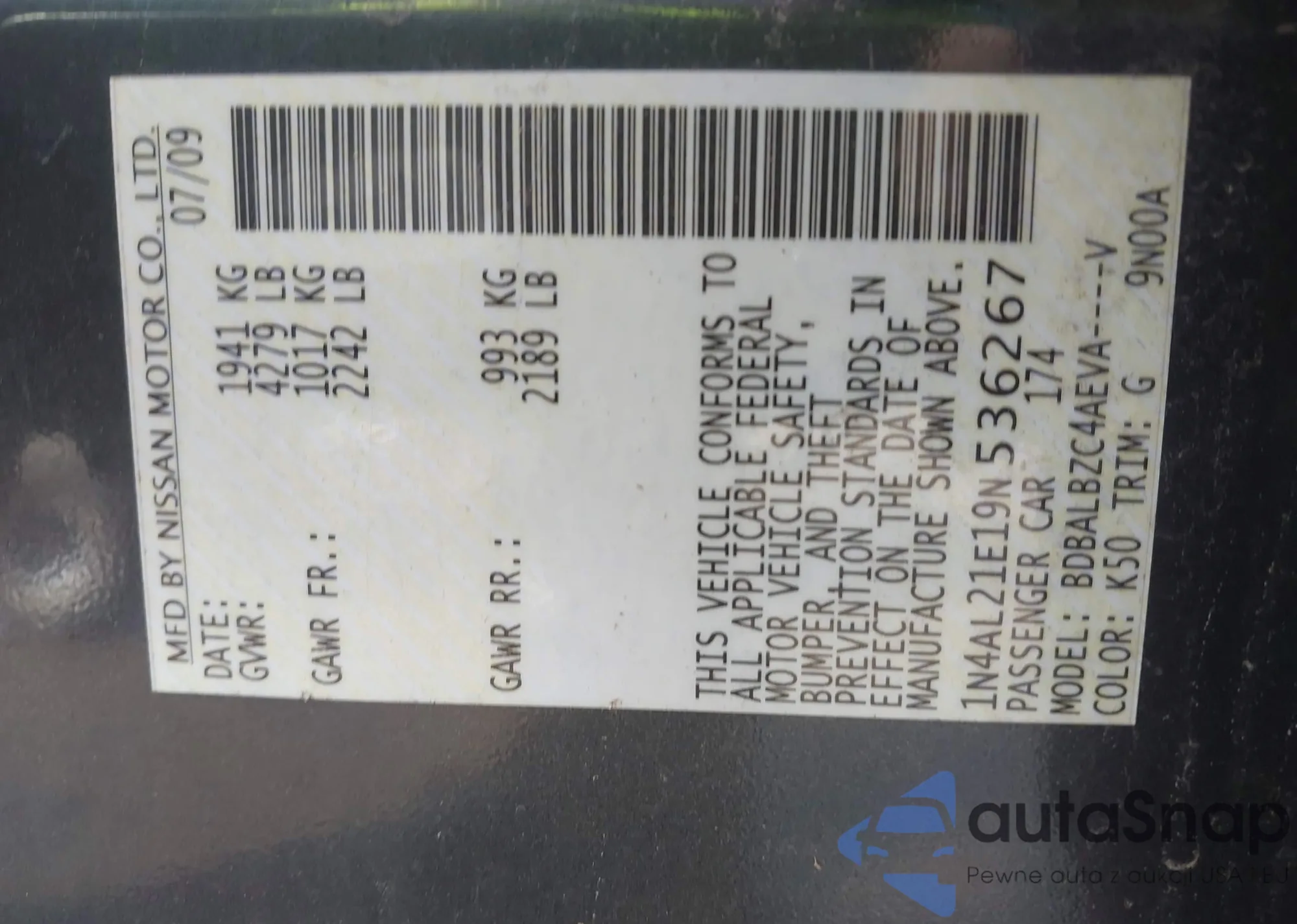 LOT: 44571053 VIN: 1N4AL21E19N536267