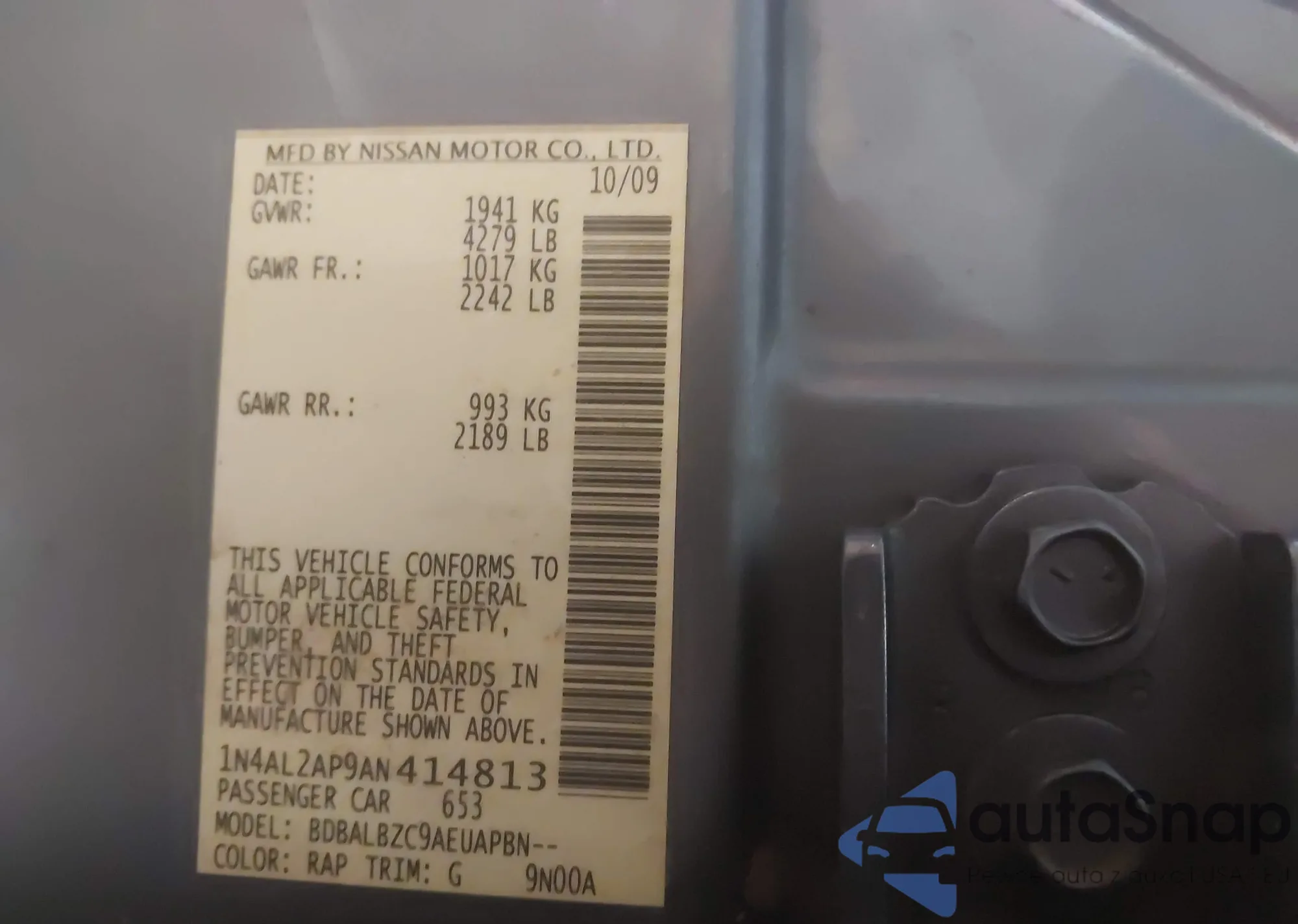 • VIN 1N4AL2AP9AN414813