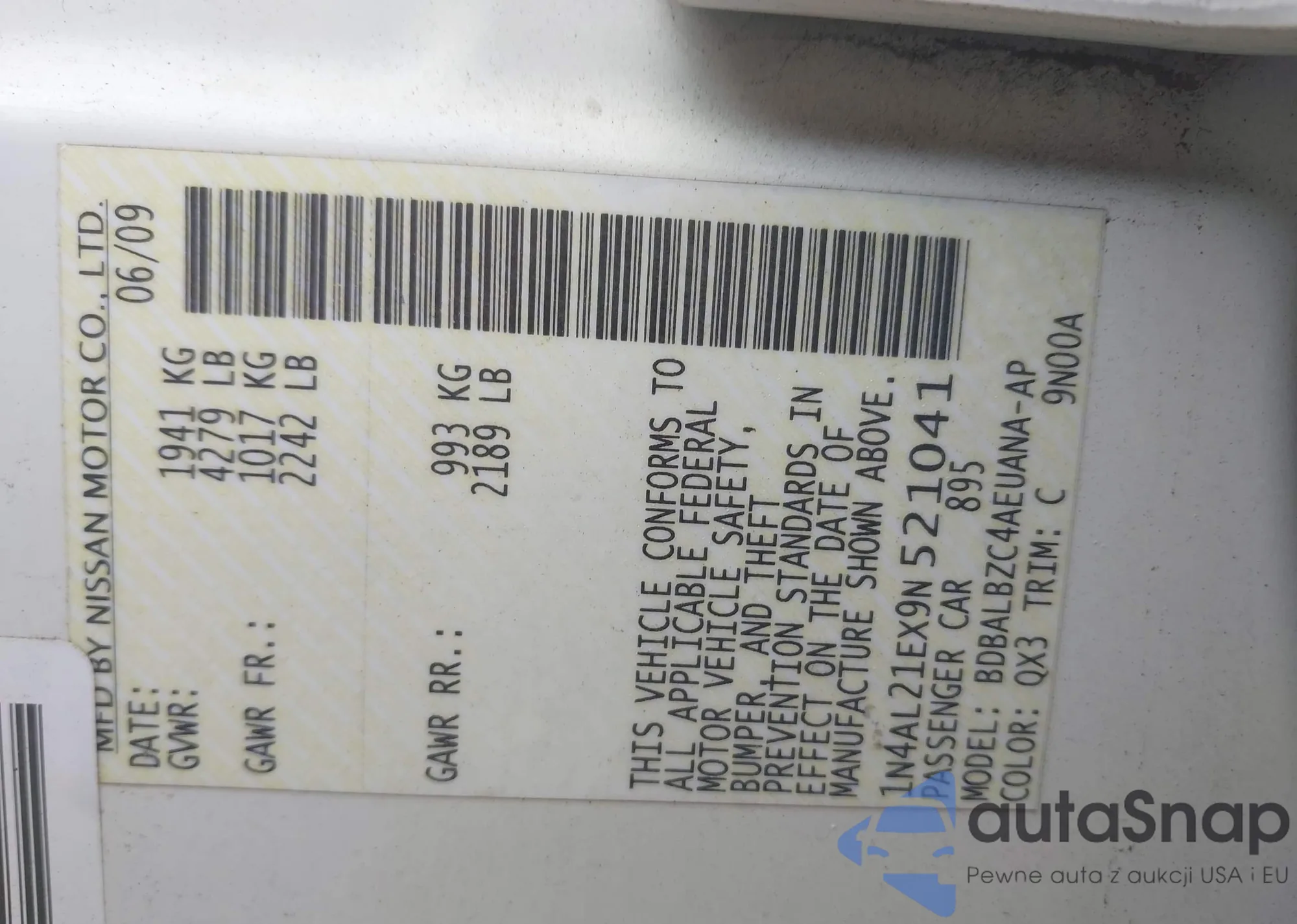 LOT: 43876455 VIN: 1N4AL21EX9N521041