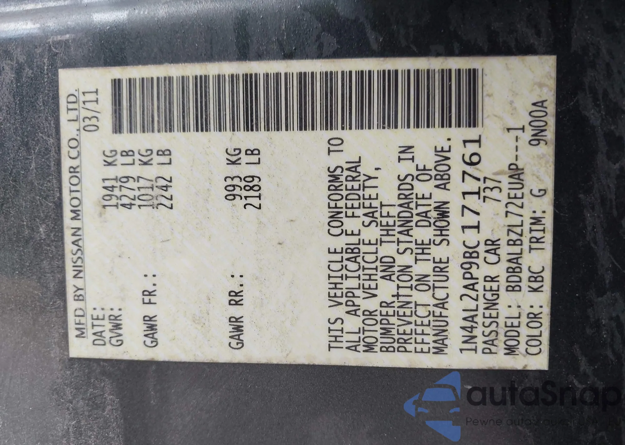 • VIN 1N4AL2AP9BC171761