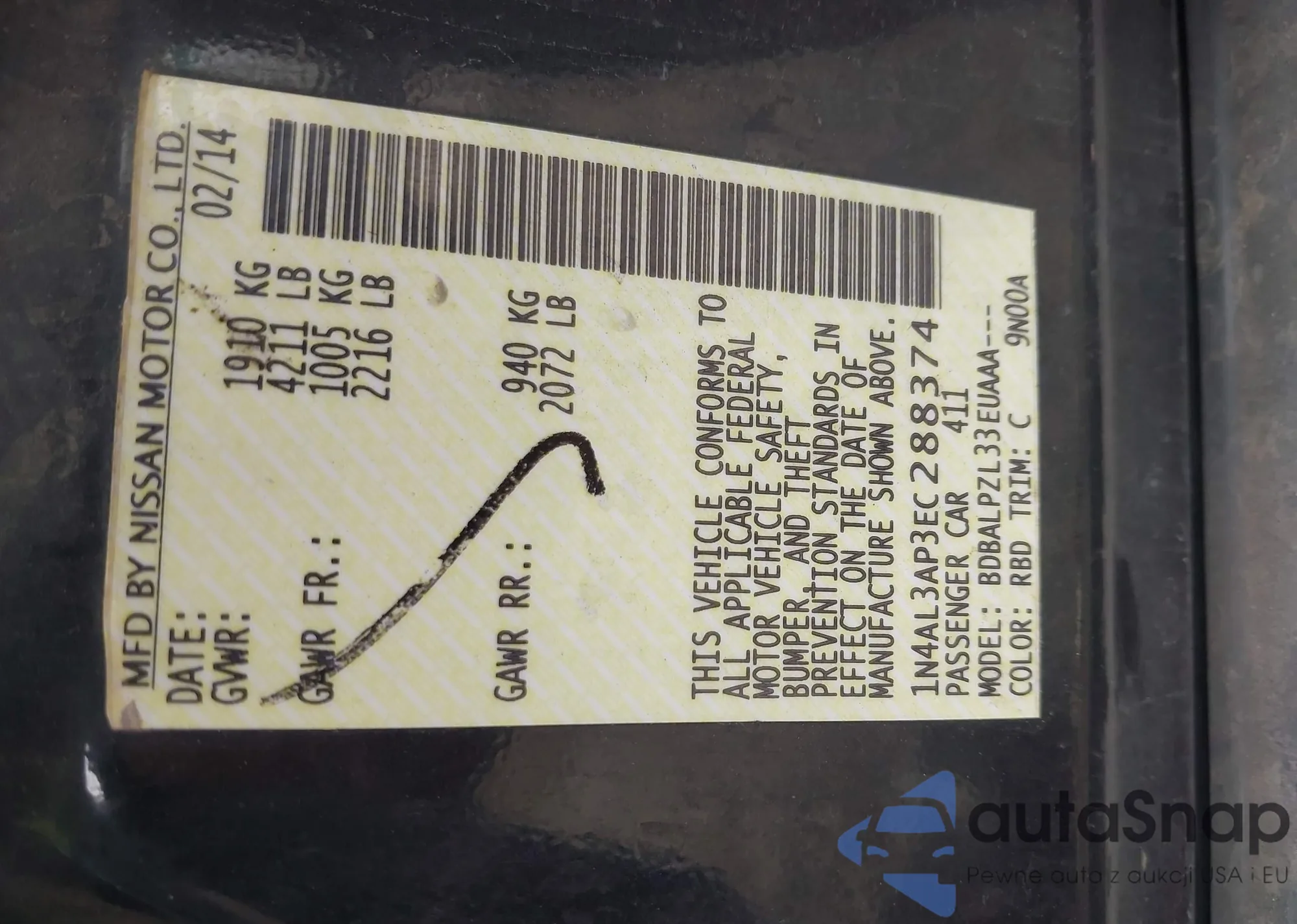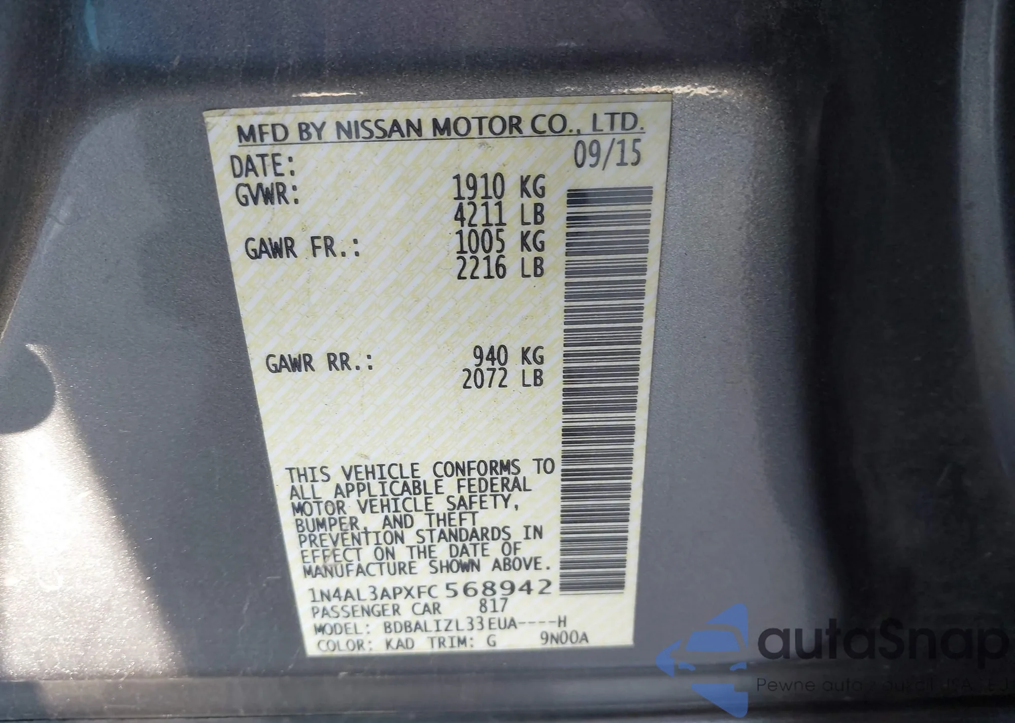 • VIN 1N4BL3AP9FC167015