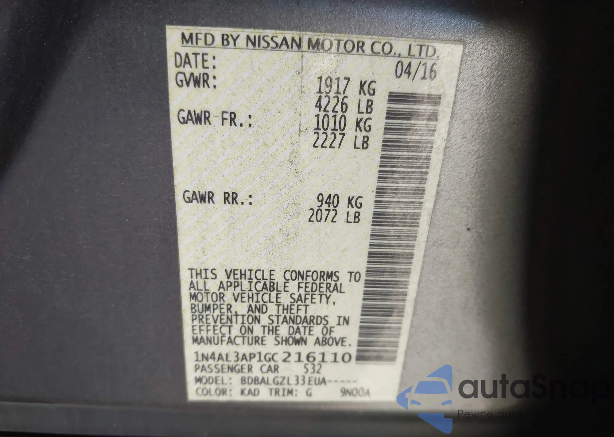 LOT: 43528947 VIN: 1N4AL3AP1GC216110