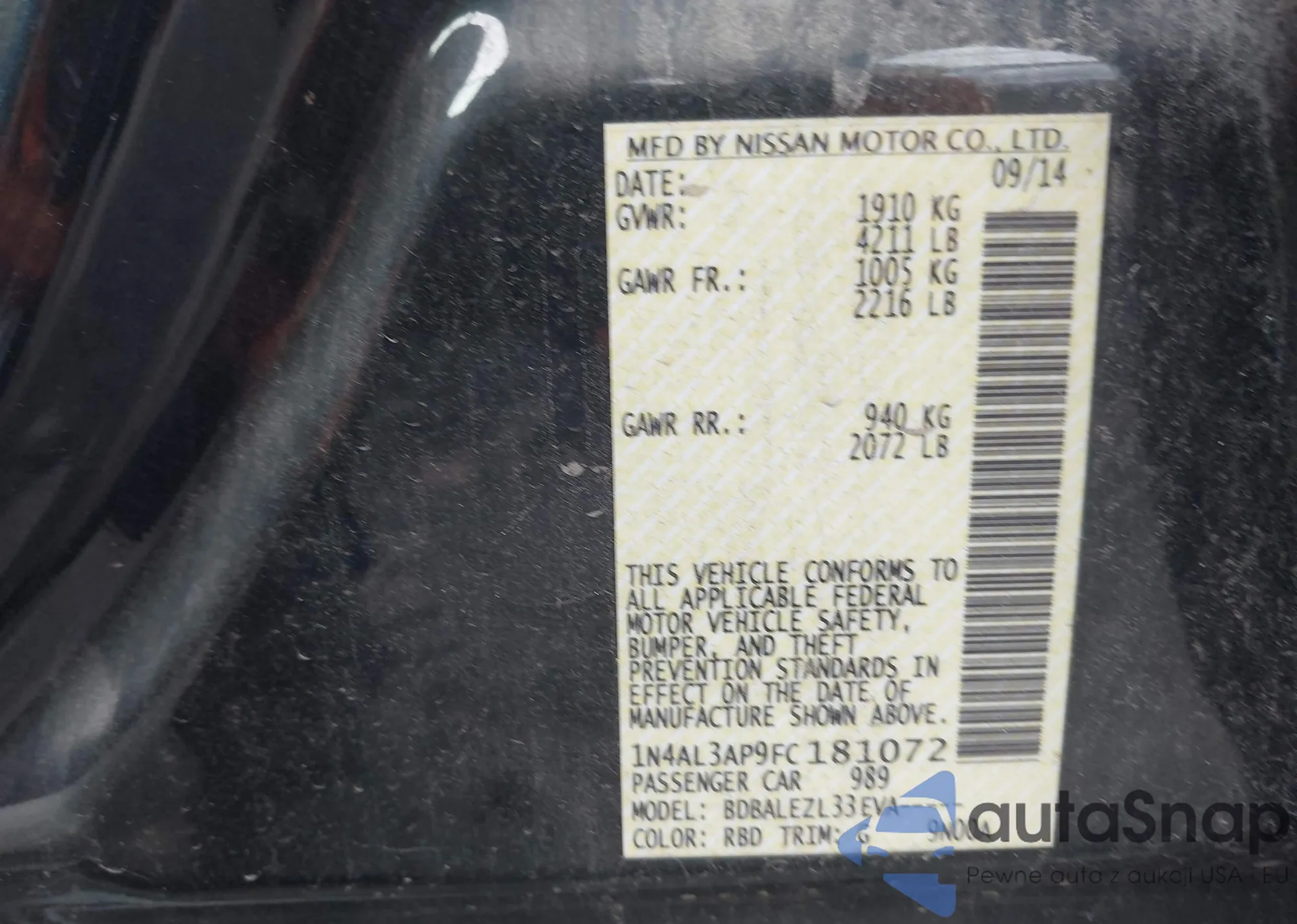 • VIN 1N4AL3AP9FC181072