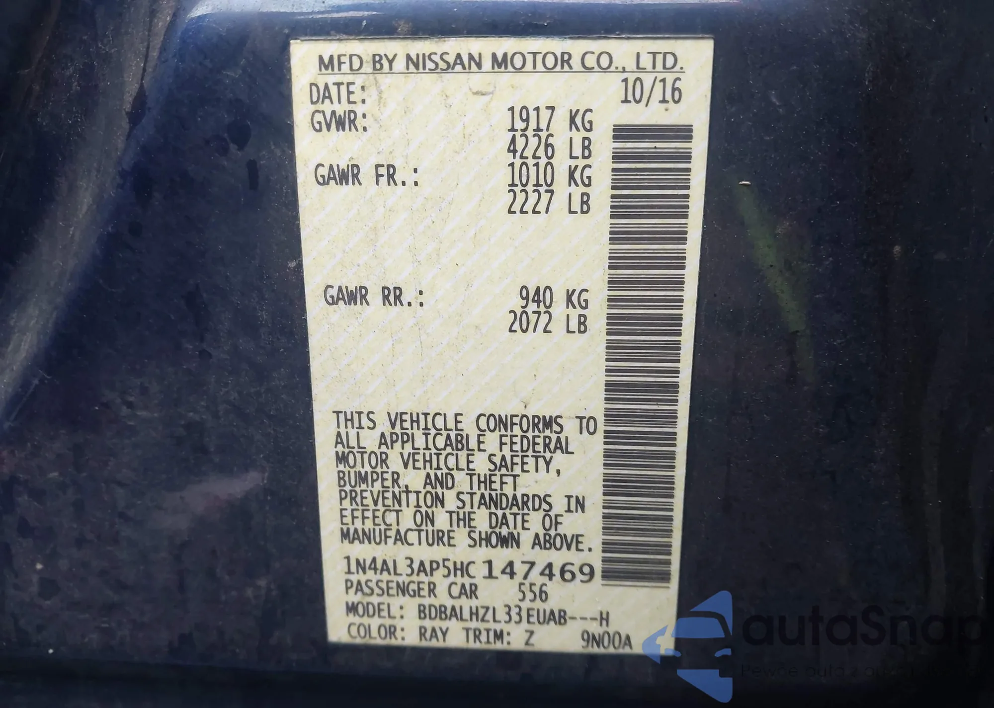 • VIN 1N4AL3AP5HC147469