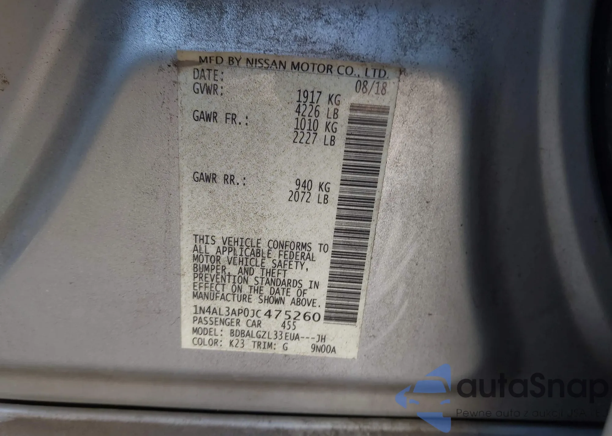 LOT: 44035994 VIN: 1N4AL3AP0JC475260