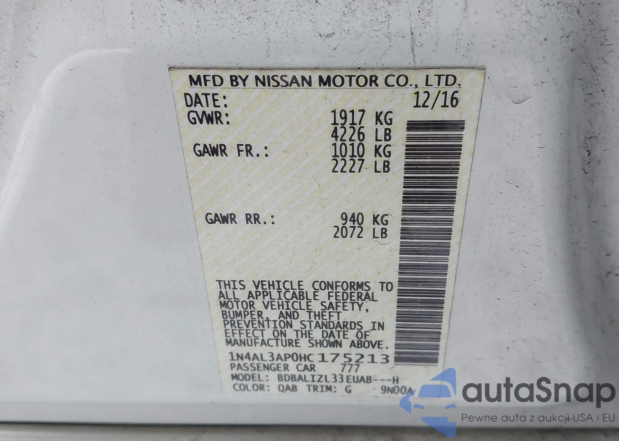 LOT: 44036675 VIN: 1N4AL3AP0HC175213