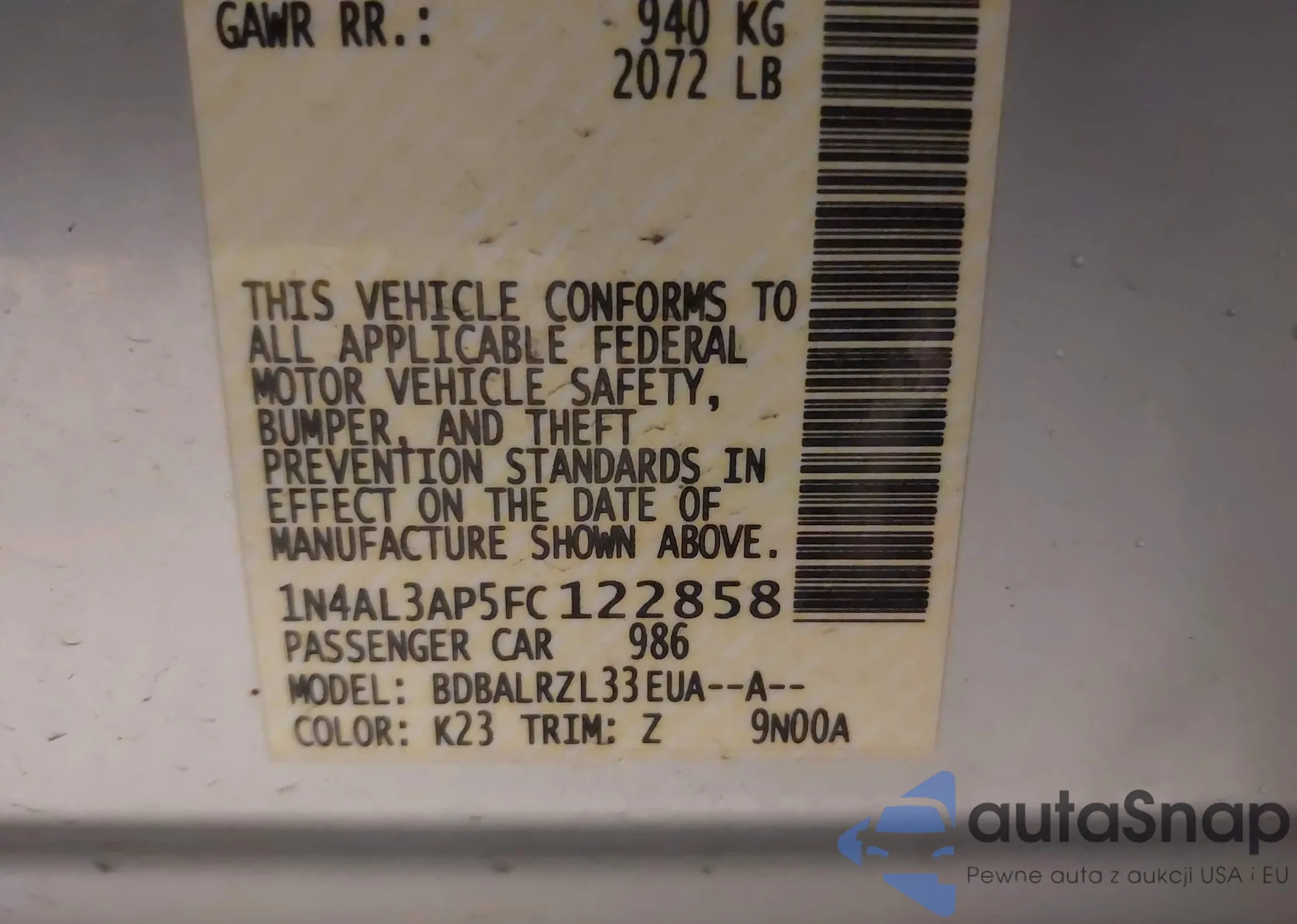 • VIN 1N4AL3AP6FC457434