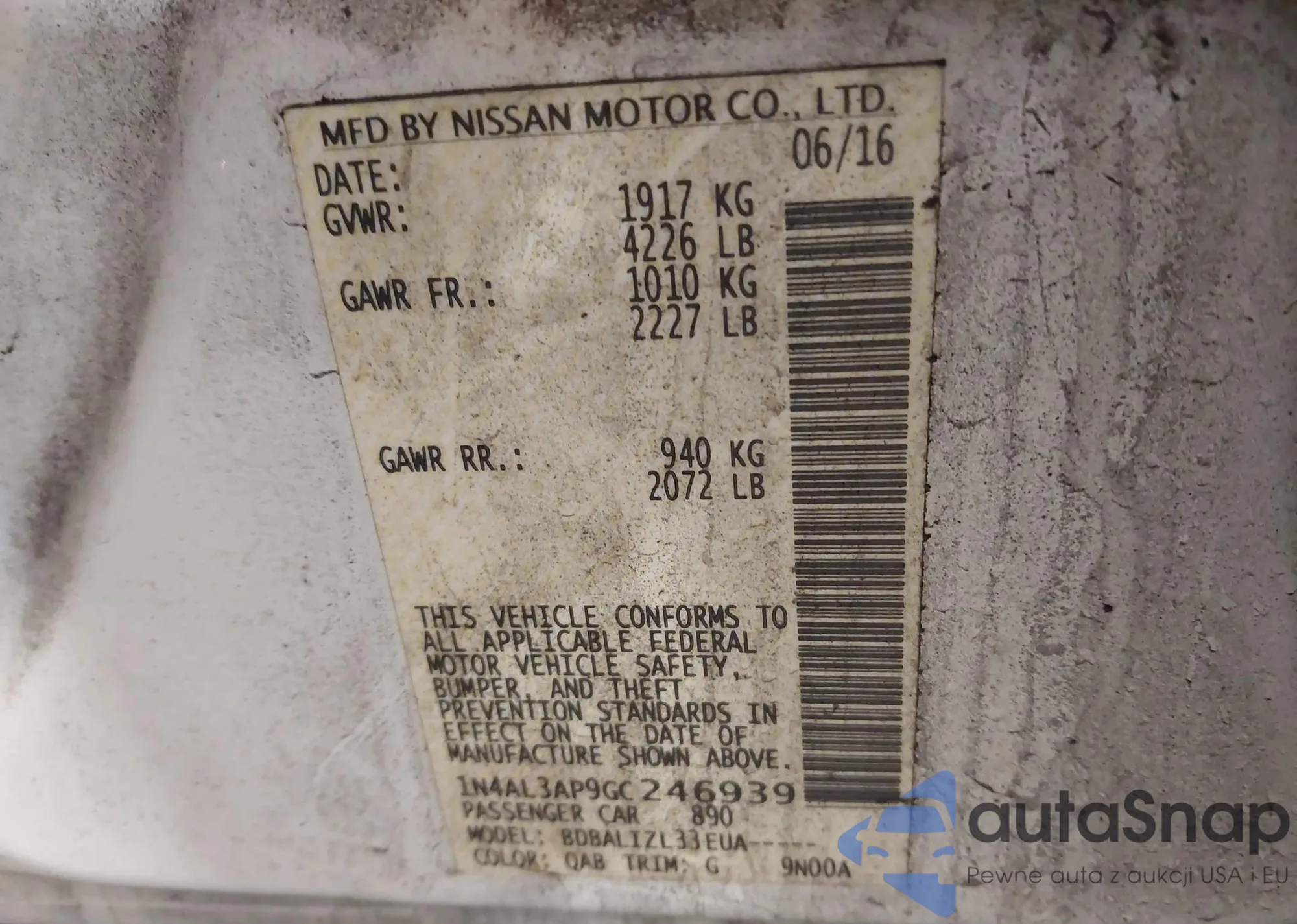 • VIN 1N4AL3AP9GC246939