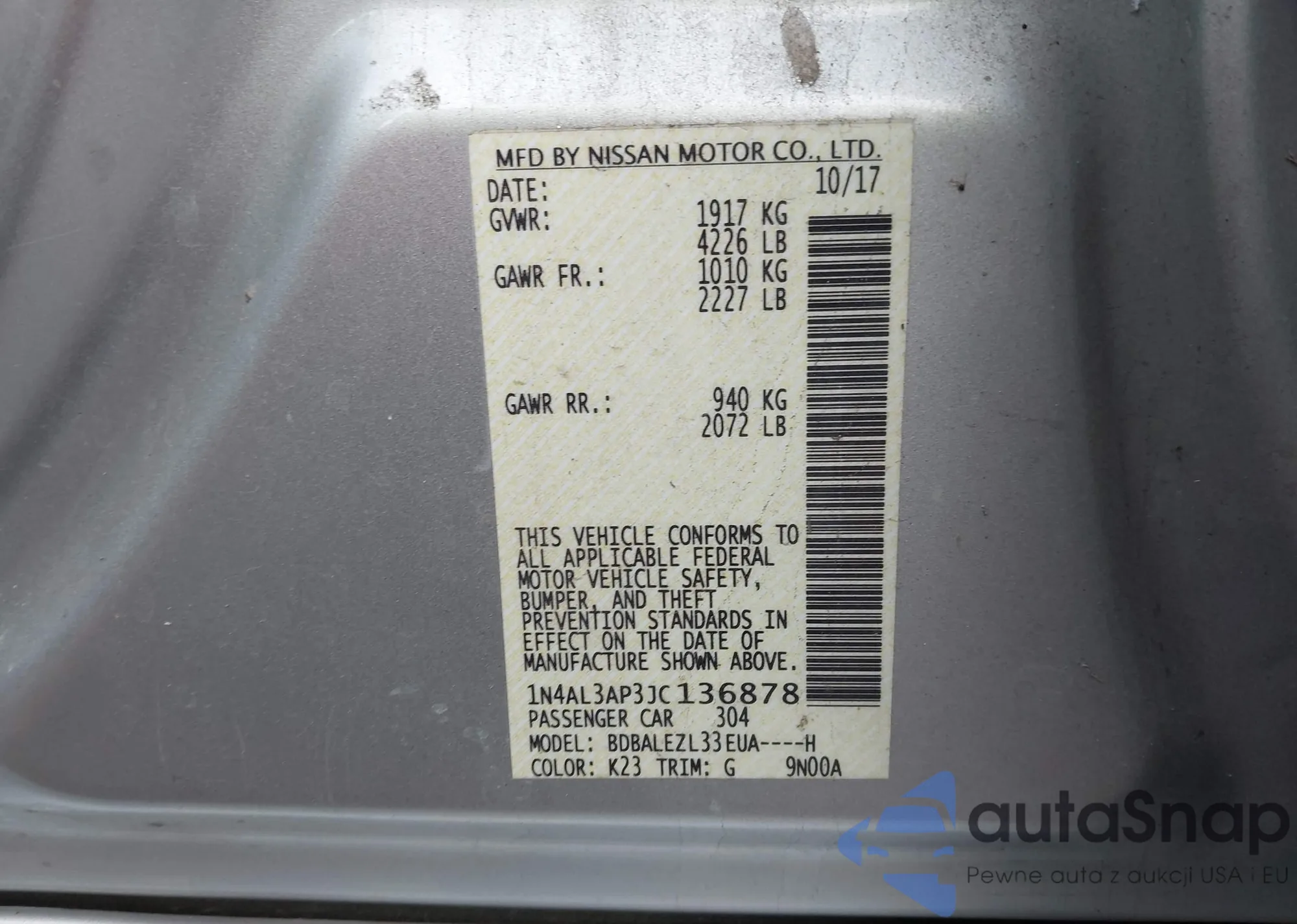 LOT: 44206133 VIN: 1N4AL3AP3JC136878