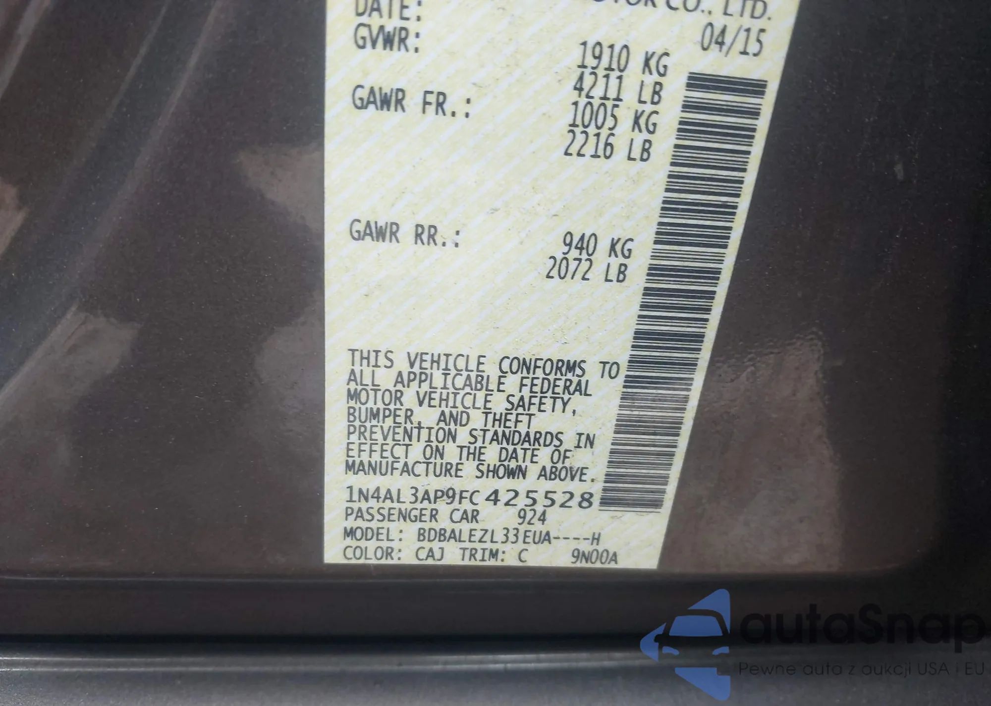 • VIN 1N4AL3AP9FC425528