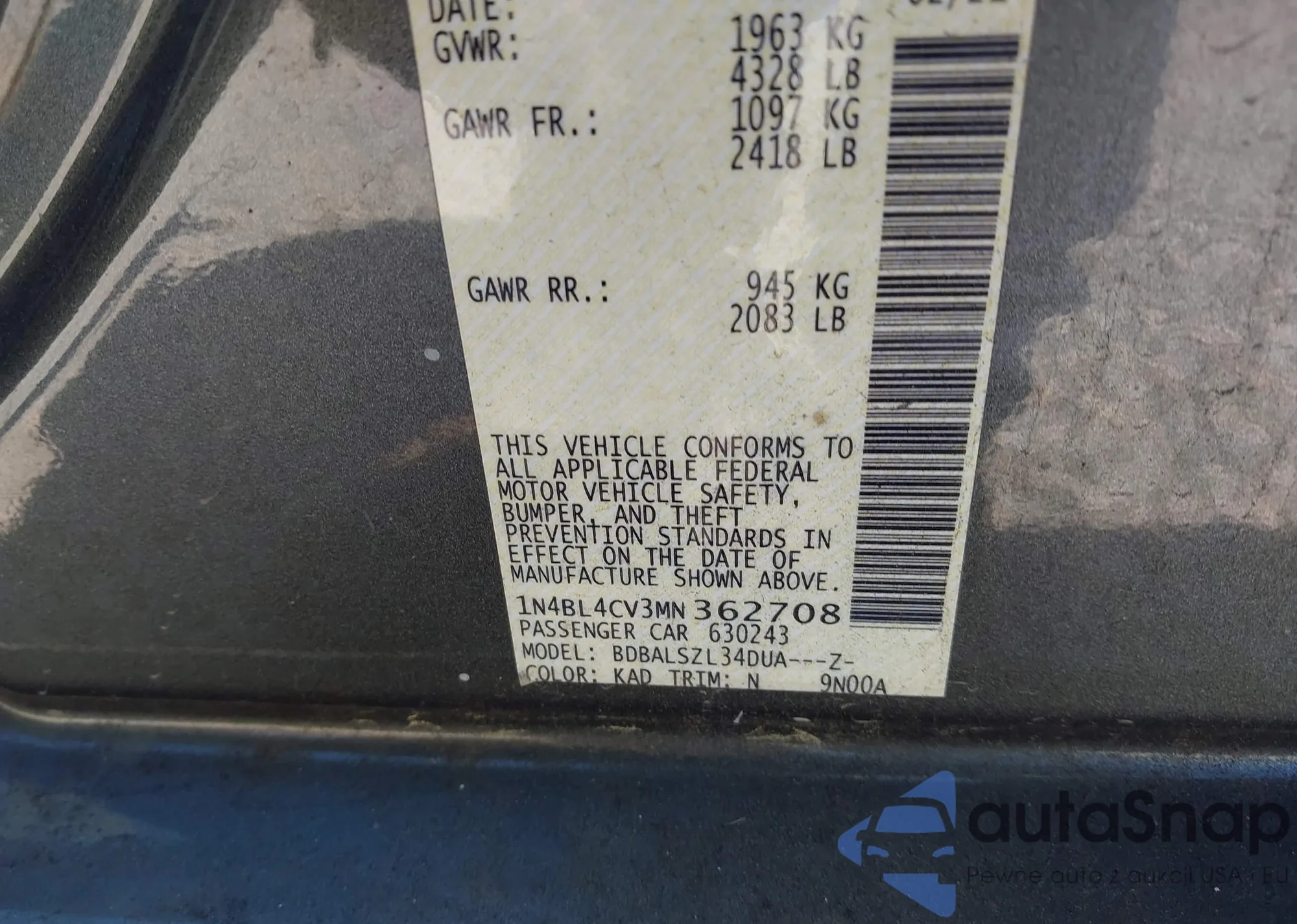 • VIN 1N4BL4CV3MN362708