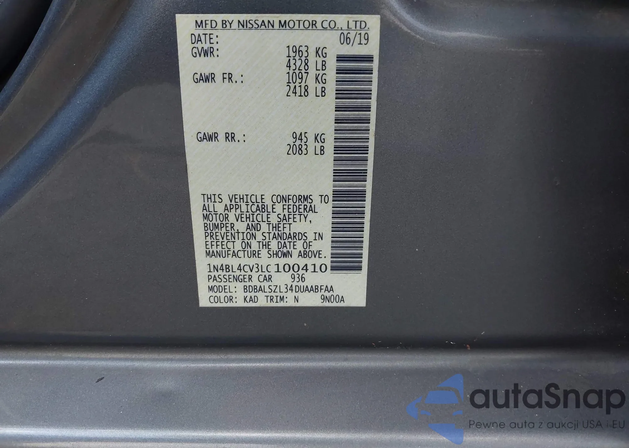 • VIN 1N4BL4CV3LC100410
