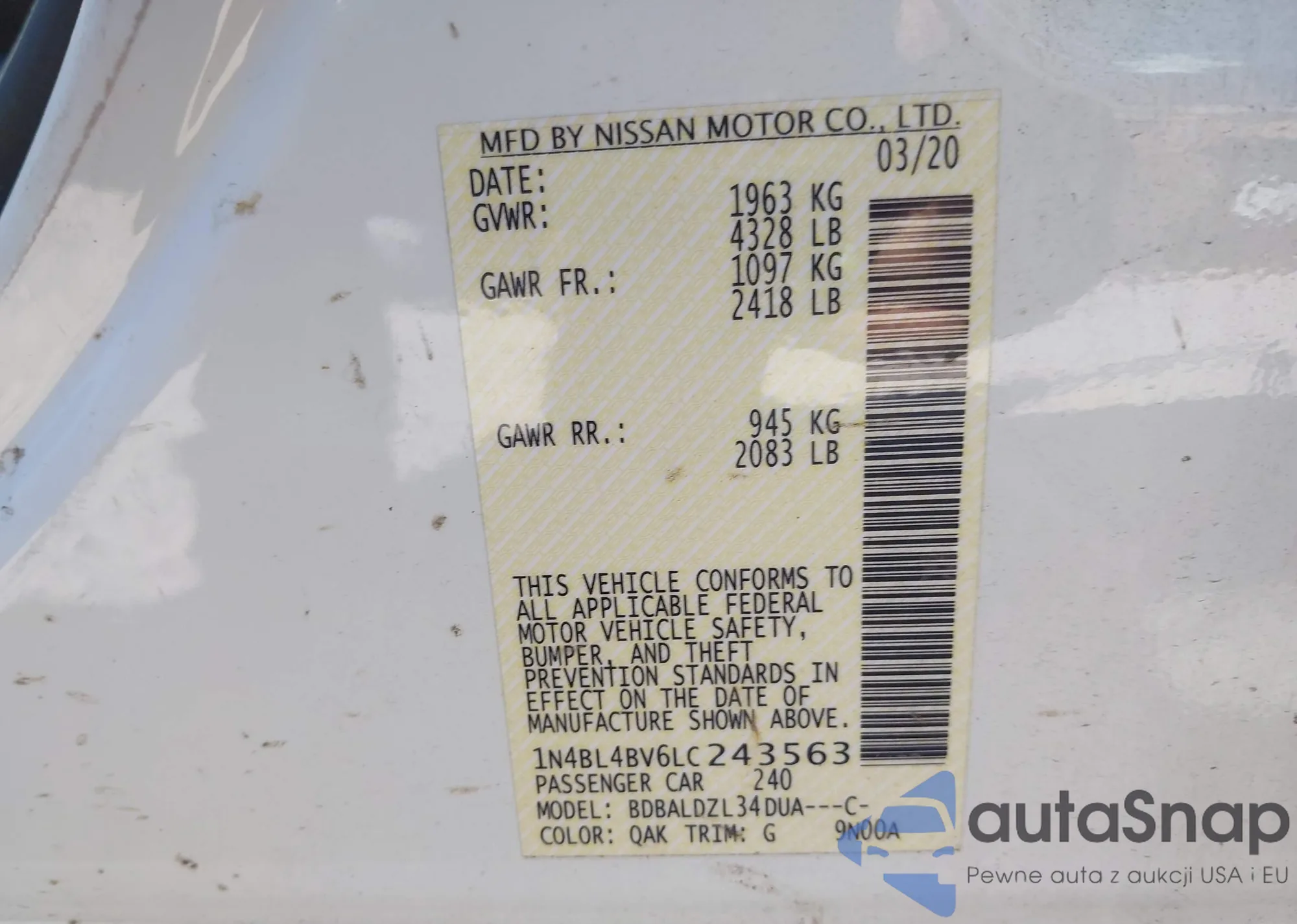 • VIN 1N4BL4BV6LC243563