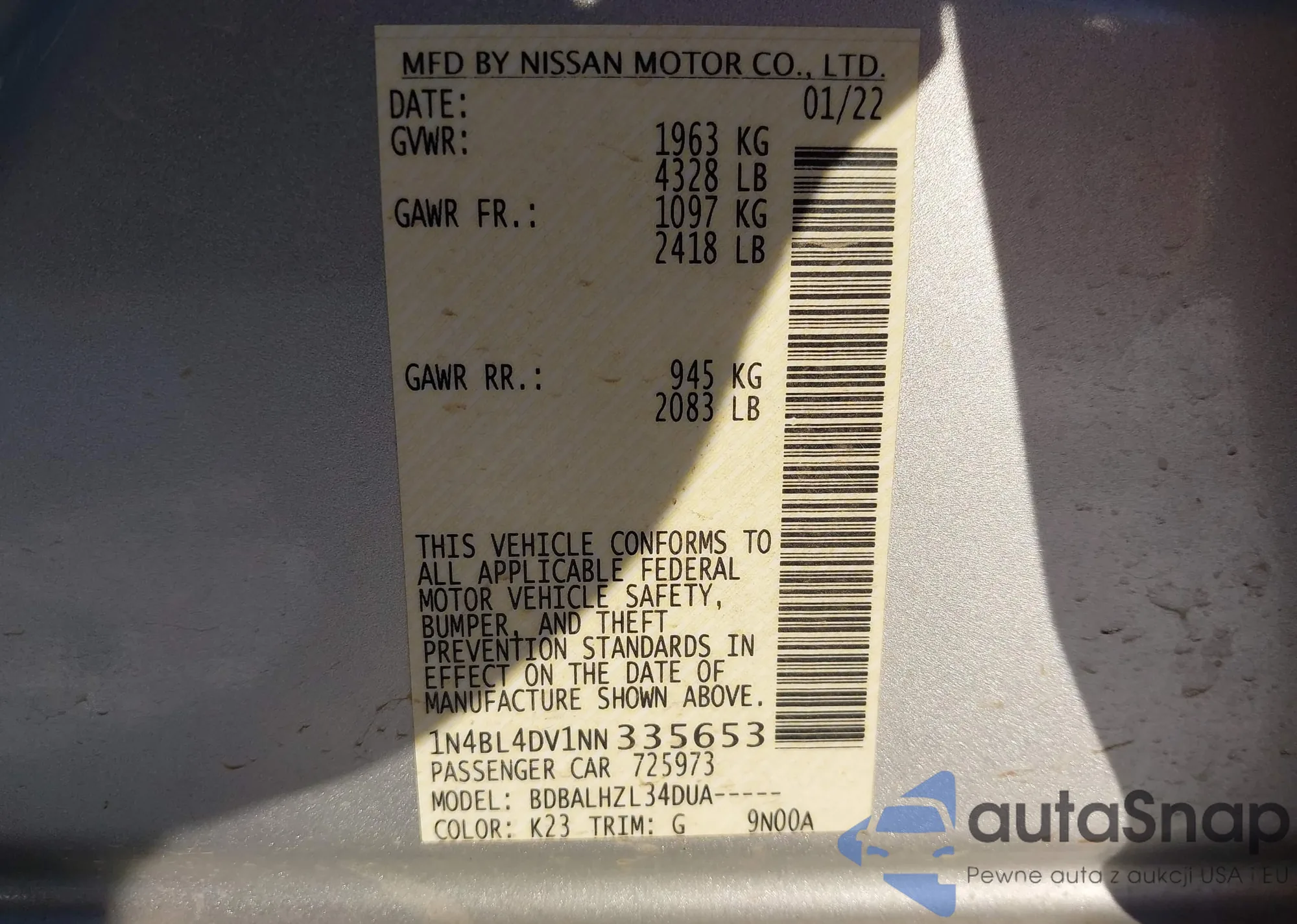 LOT: 43936446 VIN: 1N4BL4DV1NN335653