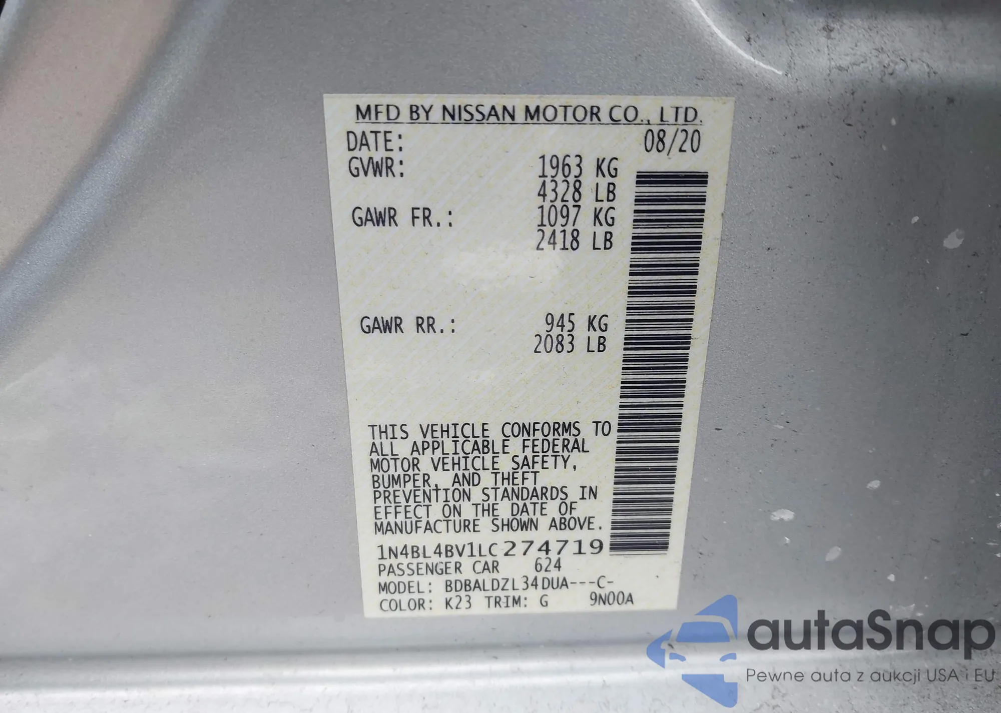 • VIN 1N4BL4BV1LC274719