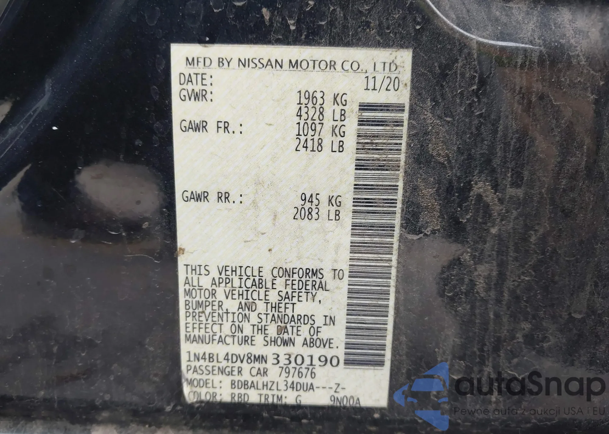 LOT: 43902267 VIN: 1N4BL4DV8MN330190