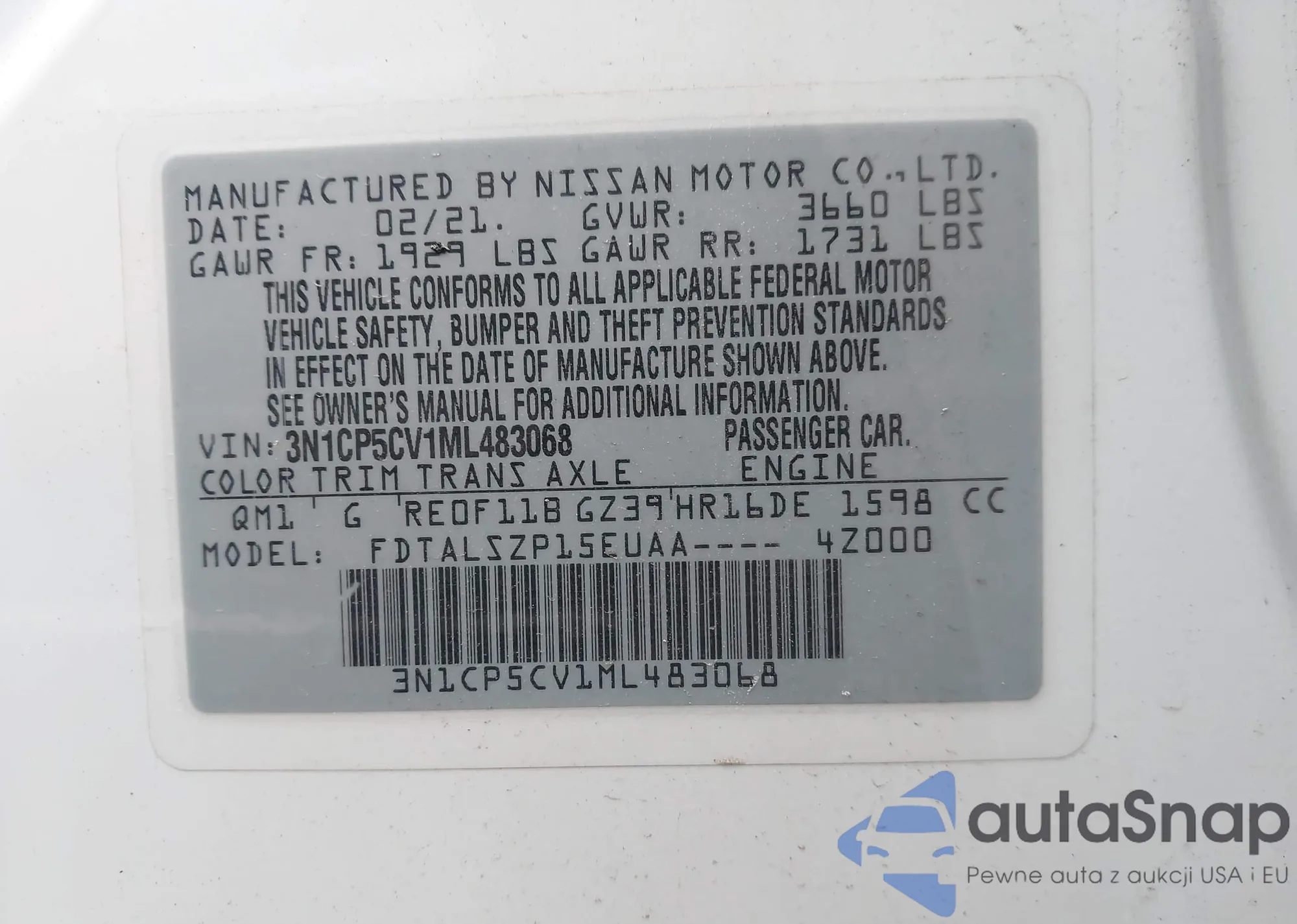 LOT: 44118329 VIN: 3N1CP5CV1ML483068