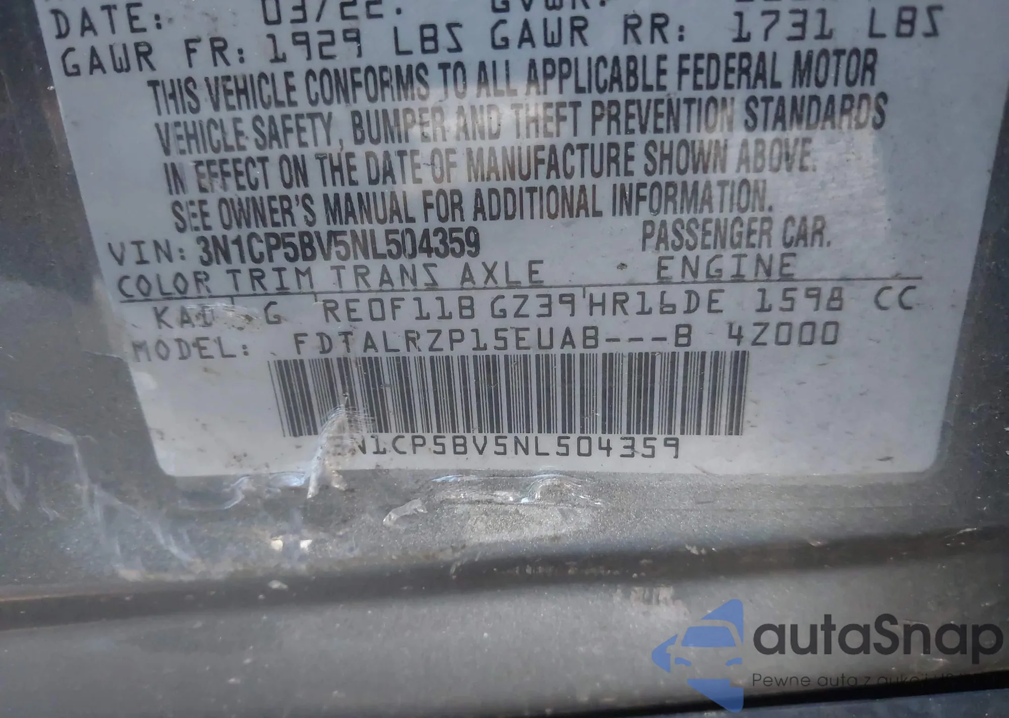 • VIN 3N1CP5BV5NL504359