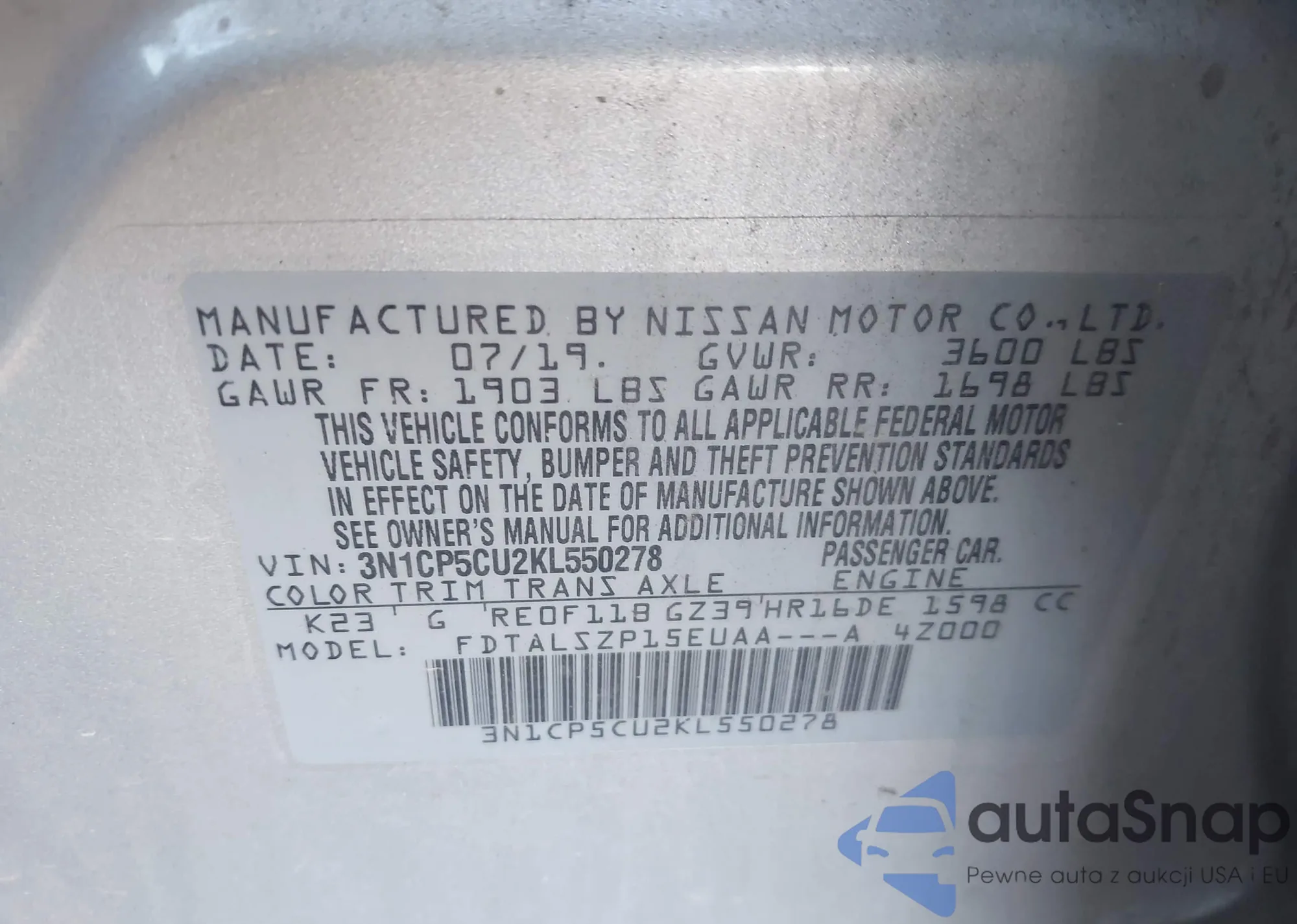 LOT: 43994922 VIN: 3N1CP5CU2KL550278