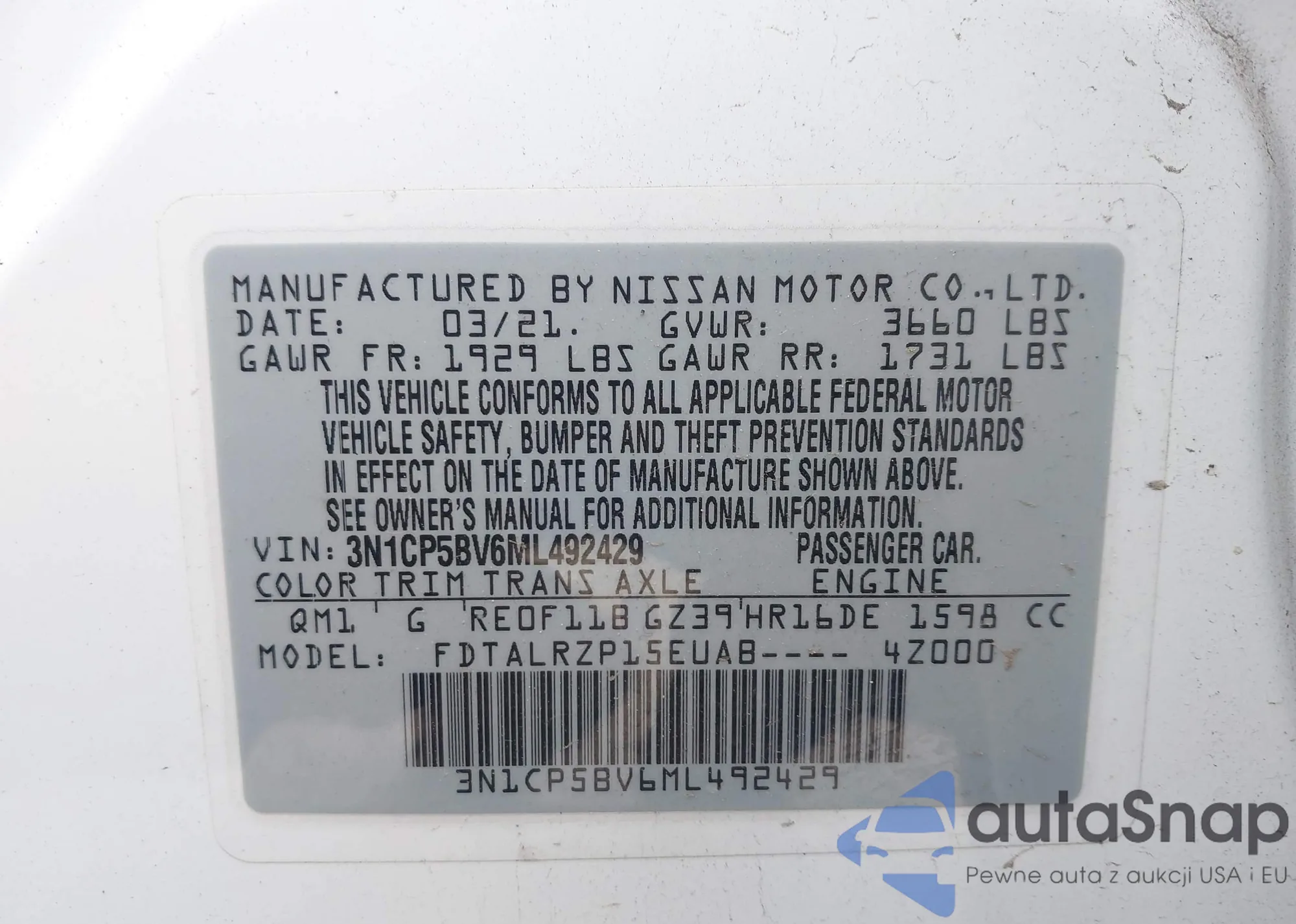 • VIN 3N1CP5BV6ML492429
