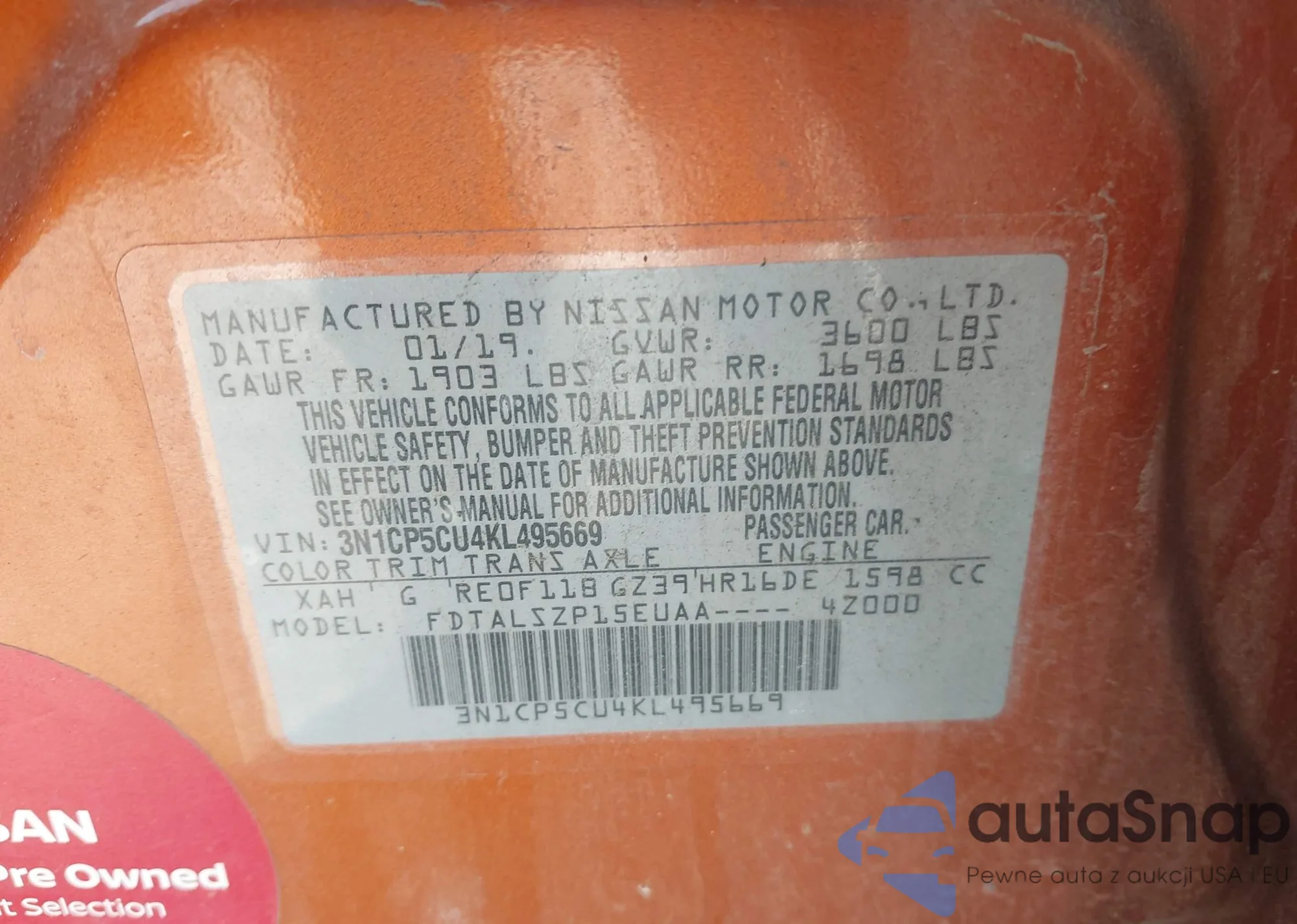 LOT: 44163955 VIN: 3N1CP5CU4KL495669