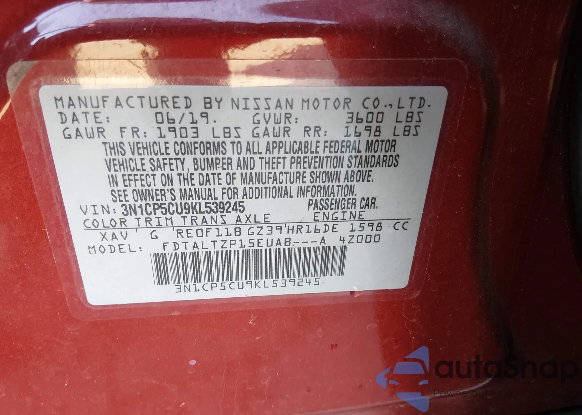 • VIN 3N1CP5CU9KL539245