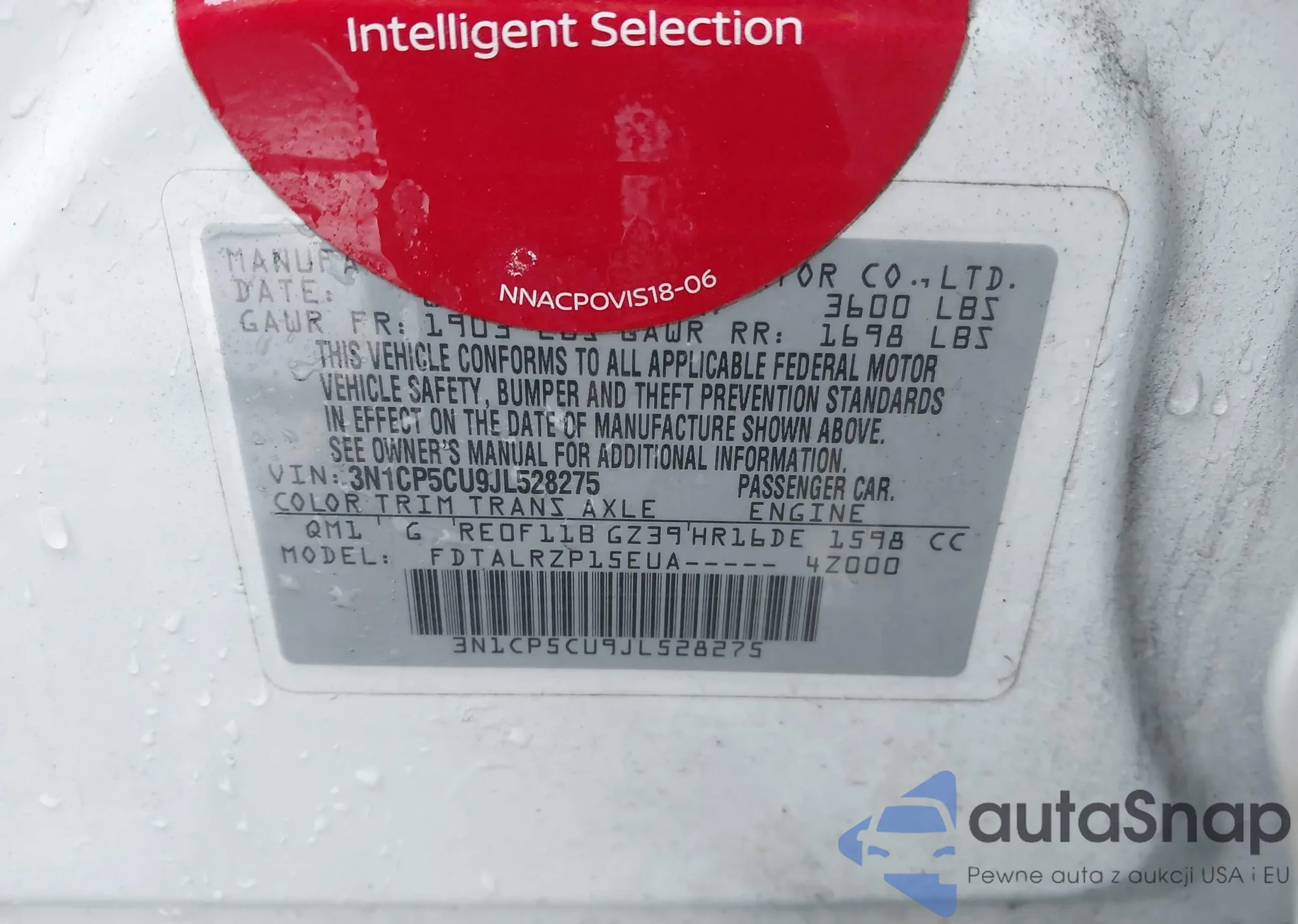 LOT: 44315601 VIN: 3N1CP5CU9JL528275