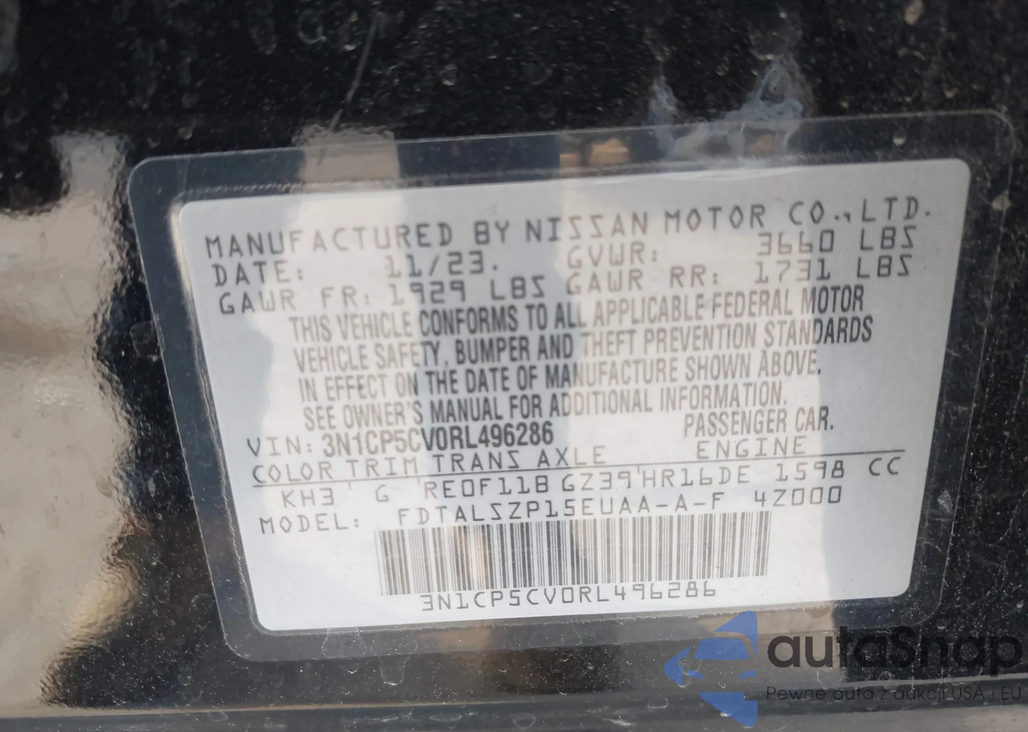 LOT: 44007599 VIN: 3N1CP5CV0RL496286