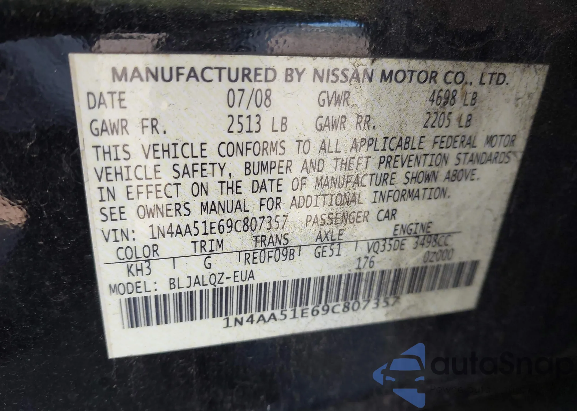 LOT: 43904527 VIN: 1N4AA51E69C807357
