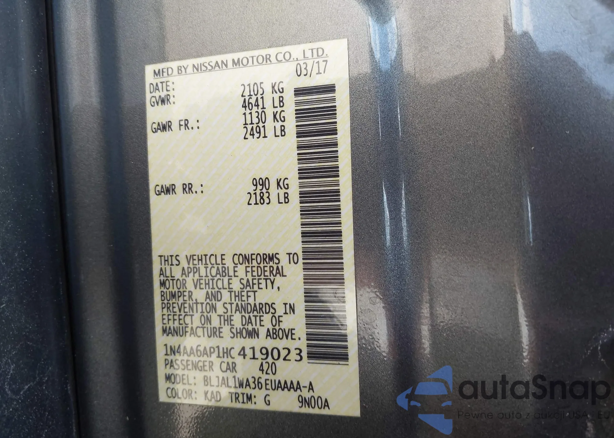 LOT: 42892605 VIN: 1N4AA6AP1HC419023