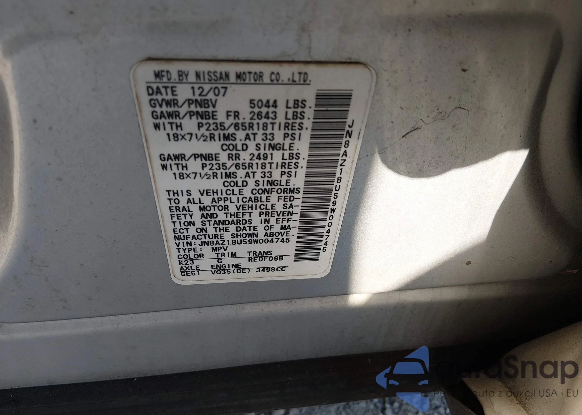 • VIN JN8AZ18U59W004745